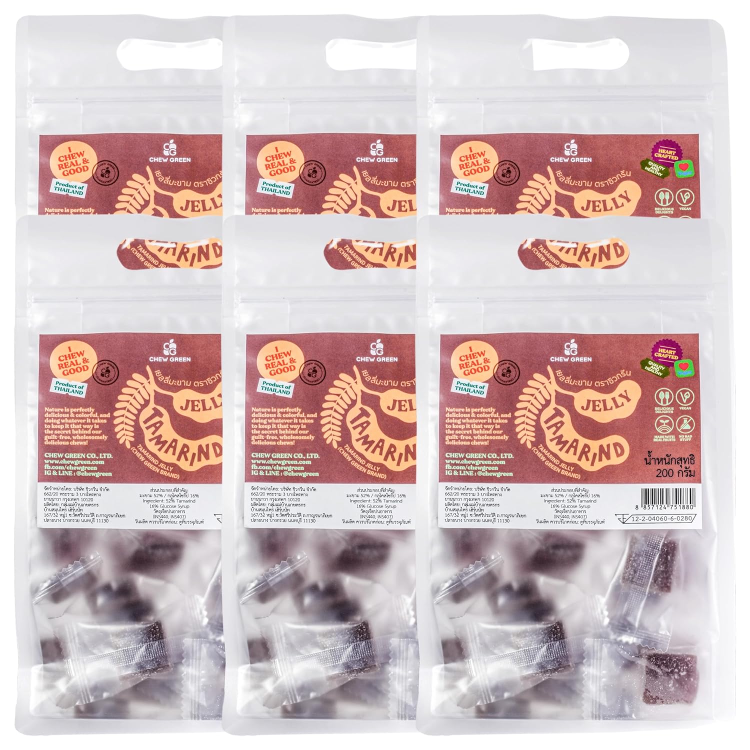 Sweet. Tangy. Individually Wrapped for Freshness. Exotic. Refreshing. Pure Fruit Fantasy.Hi there, Flavor Explorer! 👋Tired of the same old boring sweet snacks? Craving something that wakes up your palate? CHEW GREEN Thai Tamarind Gummy Jelly is your ticket to a bold new world. Packed with a staggering 52% Real Tamarind, these vegan treats bring the zesty, sun-drenched flavors of Thailand straight to your door.Why Tamarind? Because "Sweet" Needs a Kick. If you’ve ever tasted authentic Thai Tamarind, you know it’s a rollercoaster. First, a wave of natural sweetness, followed immediately by a refreshing sour tang. We captured that exact moment.The Taste: A complex harmony of sweet and sour notes that keeps you coming back for more.The Texture: Soft, jelly-like, and satisfyingly chewy.Why "Wrapped" Changes Everything: We know life moves fast. You need a snack that keeps up.On-the-Go: Toss a handful in your pocket or gym bag. They won't stick, melt, or make a mess.Hygiene: It’s the most hygienic way to share a treat with colleagues or friends.Perfect for Bold Moments: Whether you’re looking for a unique Halloween treat, a palate cleanser after dinner, or a zesty pick-me-up during a long drive—Tamarind Gummies deliver a burst of energy in every chew.Taste Nature in Every Bite. #chewbetter #yourchewsmatterSearch Terms
