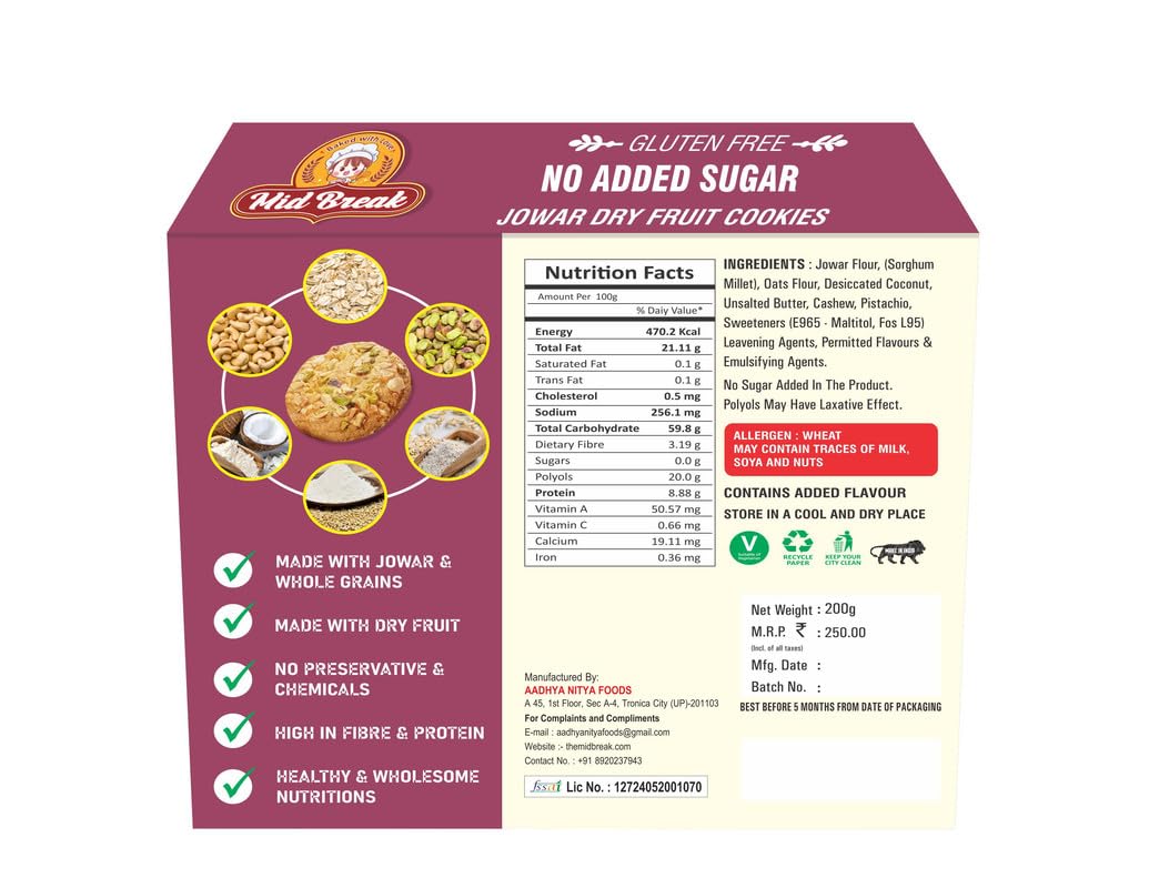 Midbreak Sugar-Free Jowar Millet & Dry Fruit Cookies | Gluten-Free Healthy Snack | High Fiber, Diabetic-Friendly | Ideal for Calorie Watchers & Gym Goers | 200g Pack