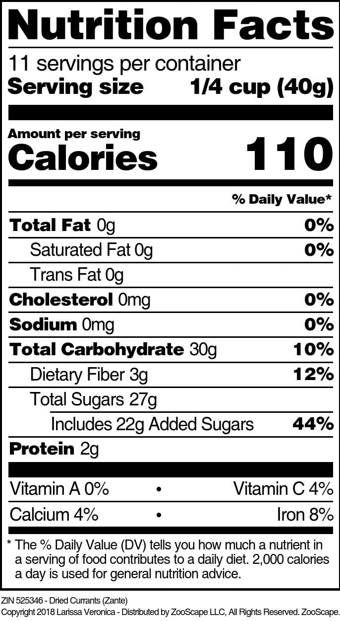 Our Dried Currants are all-natural California Zante Currants, also known as Corinth Raisins and Corinthian Raisins. Zante Currants are dried black Corinthian grapes, a variety of seedless grape berries cultivated as the Black Corinth. Dried Currants are full of flavor with a tangy, sweet taste. They are wonderful in jams, cakes, and many other ways. - Larissa Veronica is an exclusive line of natural premium-quality products that use only the purest and finest ingredients from around the world. Larissa Veronica is hallmarked by the highest possible standards of purity, stability and freshness. All of our products are prepared with the highest elements of quality control, from raw materials through the entire manufacturing process, up to and including the moment that the bottles or bags are sealed for freshness and shipped out to you. Our highest possible standards are certified by independent laboratories and backed by our personal guarantee. - Larissa Veronica strives to make all products affordable and we are constantly researching the market to maintain our affordability and to look for new ways to serve you and the ones you love. Larissa Veronica has become a trusted household name for many families. - Larissa Veronica is packed in tamper-proof, food-grade, recyclable containers. - ZooScape is proud to be the exclusive distributor of all Larissa Veronica spices, snacks, foods and ingredients in the United States, Canada and around the world. - Store Dry at 35-45 F. Vegan. Kosher for Passover. Product of South Africa.