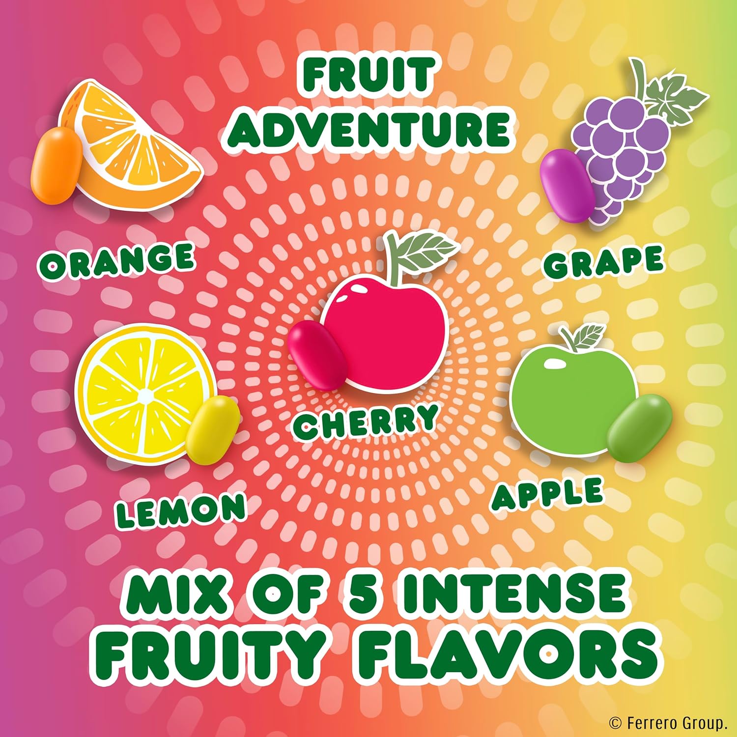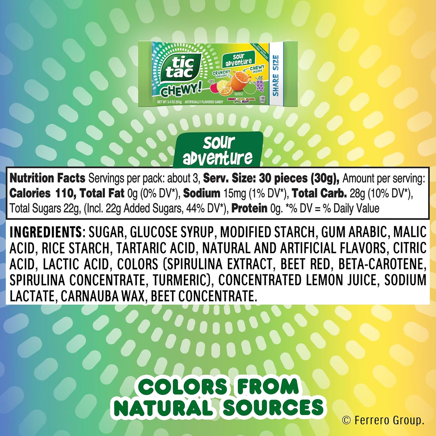 Bite into the fruity fun of TIC TAC CHEWY! Candy. Enjoy a layer of pure crunchiness surrounding a deliciously intense fruity and chewy center that will bring a bit of fruity fun to your day. Your taste adventure is waiting with 50+ layers of gently sour or intense fruity flavors in each orange, lemon, apple, cherry and grape flavored crunchy, chewy gummy candy. Delight your taste buds with the mouthwatering fruity blend of Fruit Adventure or indulge in the zesty, sour fruity blend of Sour Adventure. The flavors are fruity, while the colors are made from natural sources. That's a sweet win-win. You have found the perfect chewy fruity candy that will dazzle your taste buds with every delicious bite. This 8 pack of crunchy, chewy candy fruity treats is great to share with your besties and also makes excellent movie candy, gaming treats, office candy bowl fillers, and a perfect on-the-go treat. Start your taste adventure with the crunchy, chewy deliciousness of TIC TAC CHEWY!