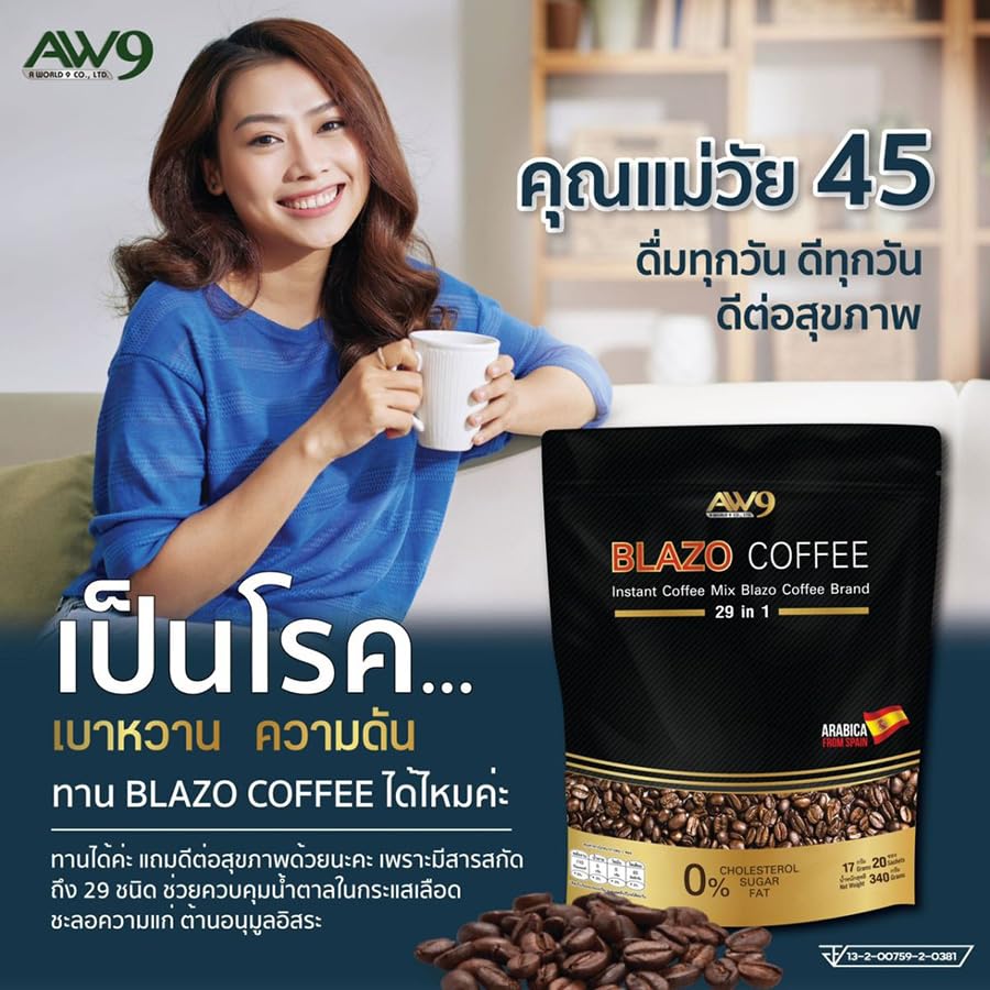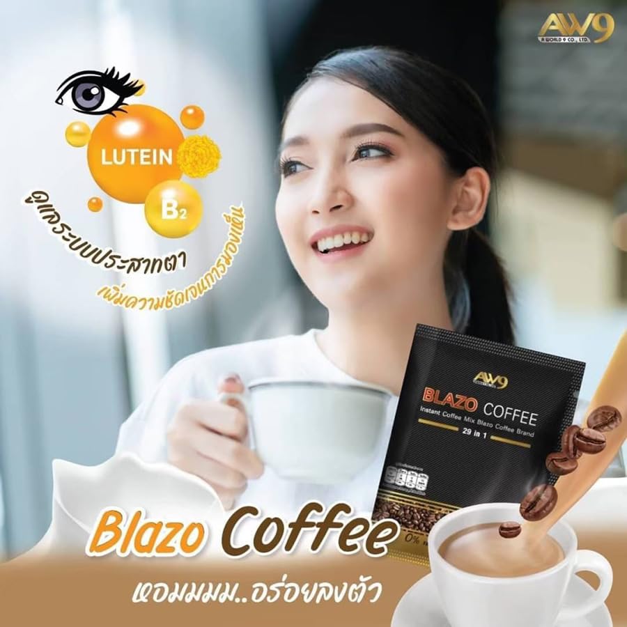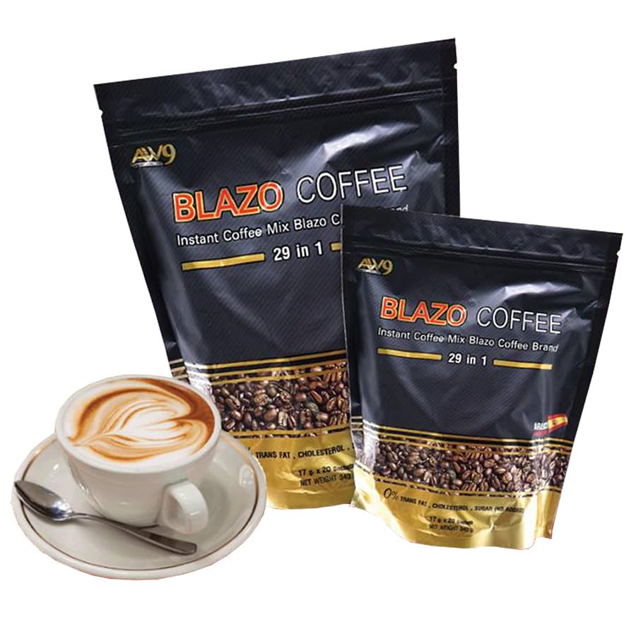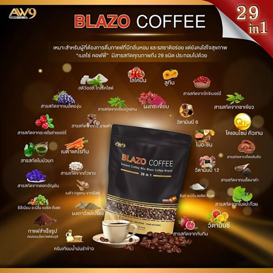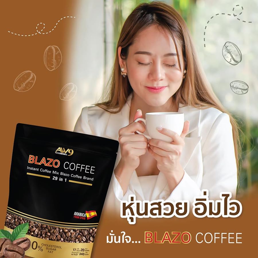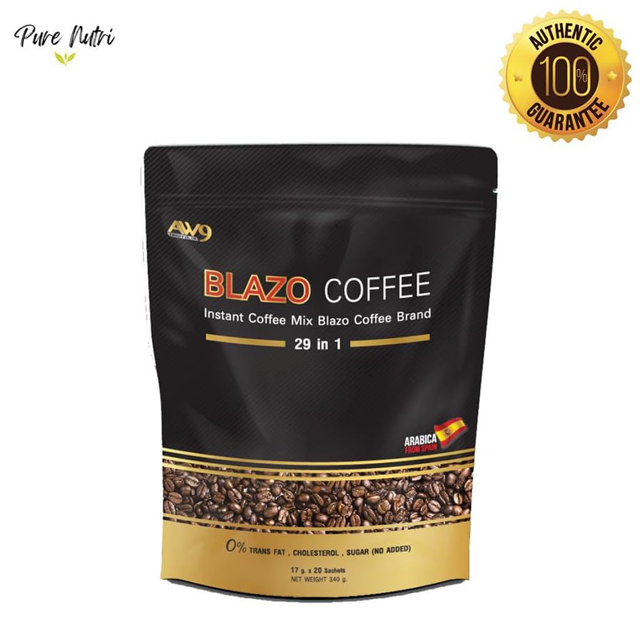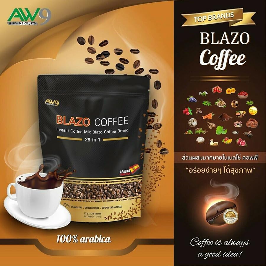 vFor more great products please visit Beautygoodshop @ Amazon.com Blazo Coffee Instant Coffee Premium Arabica 29in1 Non-Fat Sugar-Free 0% Snack.✅ 100% Authentic. ✅ Condition: 100% Brand new, seal, never used, never opened. ✅ 100% Arabica. ✅ 0% Sugar. ✅ 0% Cholesterol.Blazo Coffee is suitable for those who want to drink coffee with a delicious aroma and taste.Good for health because we select premium grade coffee beans. Arabica species from Spain. Result in an authentic coffee taste that is fragrant, intense, mellow, and has many benefits.Creamer extracted from rice bran extract. Provides a gentle sweetness from natural extracts.BLAZO Coffee is made from premium-grade Arabica coffee beans. from Spain. And it consists of 29 other grains (29 IN 1). Through the production process that has been certified by the international quality assurance system GMP/HACCP. The taste is fragrant, mellow, easy to drink, useful, worthwhile, and suitable for coffee lovers. ❂ Size: 17g x 20 Sachets (340gram) / Pack.❂ Condition: Brand new & Never used with a sealed pack.❂ Registration Number: 13-2-00759-2-0377.❂ Directions: Apply 1-2 sachets per by mixing with 120 ml of hot water, stir well to dissolve, then you will get the aromatic coffee ready to serve.
