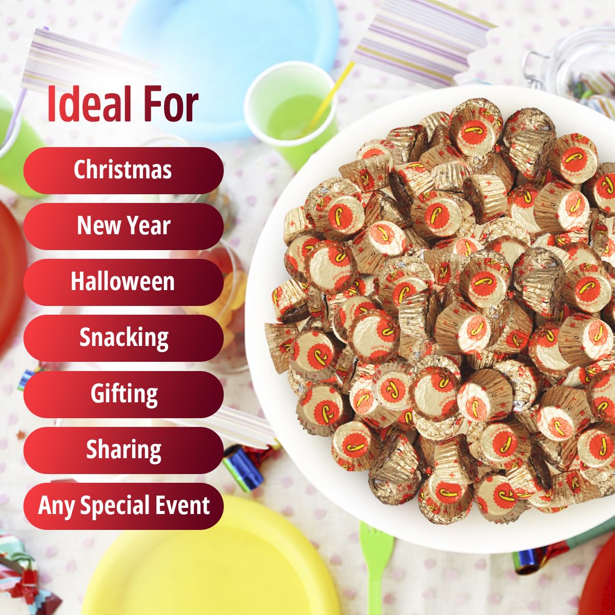 Experience Chocolate and Peanut Butter Delight CupsElevate your snacking, party planning, and gifting with the peanut butter cups 2lb pack, a rich and indulgent collection of milk chocolate peanut butter miniature cups. Whether you’re sharing with family and friends, stocking a candy bowl or simply treating yourself, this assortment of peanut butter cups delivers creamy, sweet satisfaction in every bite.A Delicious Miniature Peanut Butter Cup Variety for Every OccasionThis pack features mini Reesepeanut butter cups, offering a perfect combination of smooth milk chocolate and rich peanut butter filling. From casual snacking to dessert toppings, each peanut butter cup is crafted to delight chocolate and peanut butter lovers of all ages.Bulk Peanut Butter Cups for Sharing, Gifting and Everyday IndulgencePacked in a generous 2lb bag of peanut butter cups bulk, this collection ensures there’s always plenty to enjoy, share or gift. Whether you’re stocking up for holidays, parties, office snacks or movie nights, these peanut butter cups bulk deliver great taste and value.Discover the Joy– Your Go To Chocolate and Peanut Butter TreatsFrom casual snacking to festive occasions, the Reespeanut butter cups bulk 2lb pack is a trusted favorite for chocolate and peanut butter enthusiasts. Add this assortment of mini Reespeanut butter cups treats to your cart today and experience the perfect combination of creamy peanut butter and smooth milk chocolate in every bite.