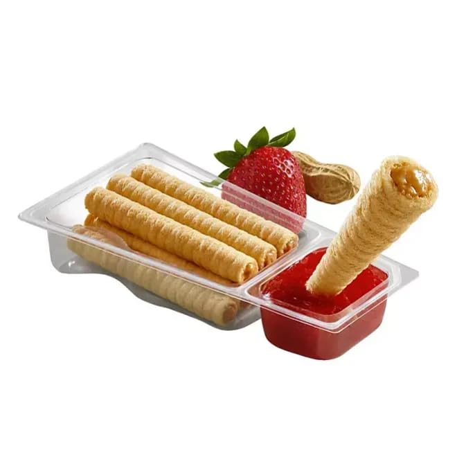 Indulge in the perfect fusion of classic flavors with Peanut Butter & Jelly Wafer Sticks. Each pack contains delightfully crispy wafer sticks filled with the nostalgic combination of creamy peanut butter and sweet jelly. These convenient 2.1 oz snacks come in a value pack of 12, making them perfect for lunchboxes, quick snacks, or satisfying your sweet cravings on the go. The light, airy texture of the wafer pairs beautifully with the rich, nutty peanut butter and fruity jelly filling, creating an irresistible taste experience. These wafer sticks offer a fun twist on the traditional sandwich, packaged in a portable format that's easy to share or save for later. Whether you're packing them for school lunches, enjoying them as an afternoon treat, or serving them at parties, these wafer sticks bring a delicious blend of familiar flavors in every bite.