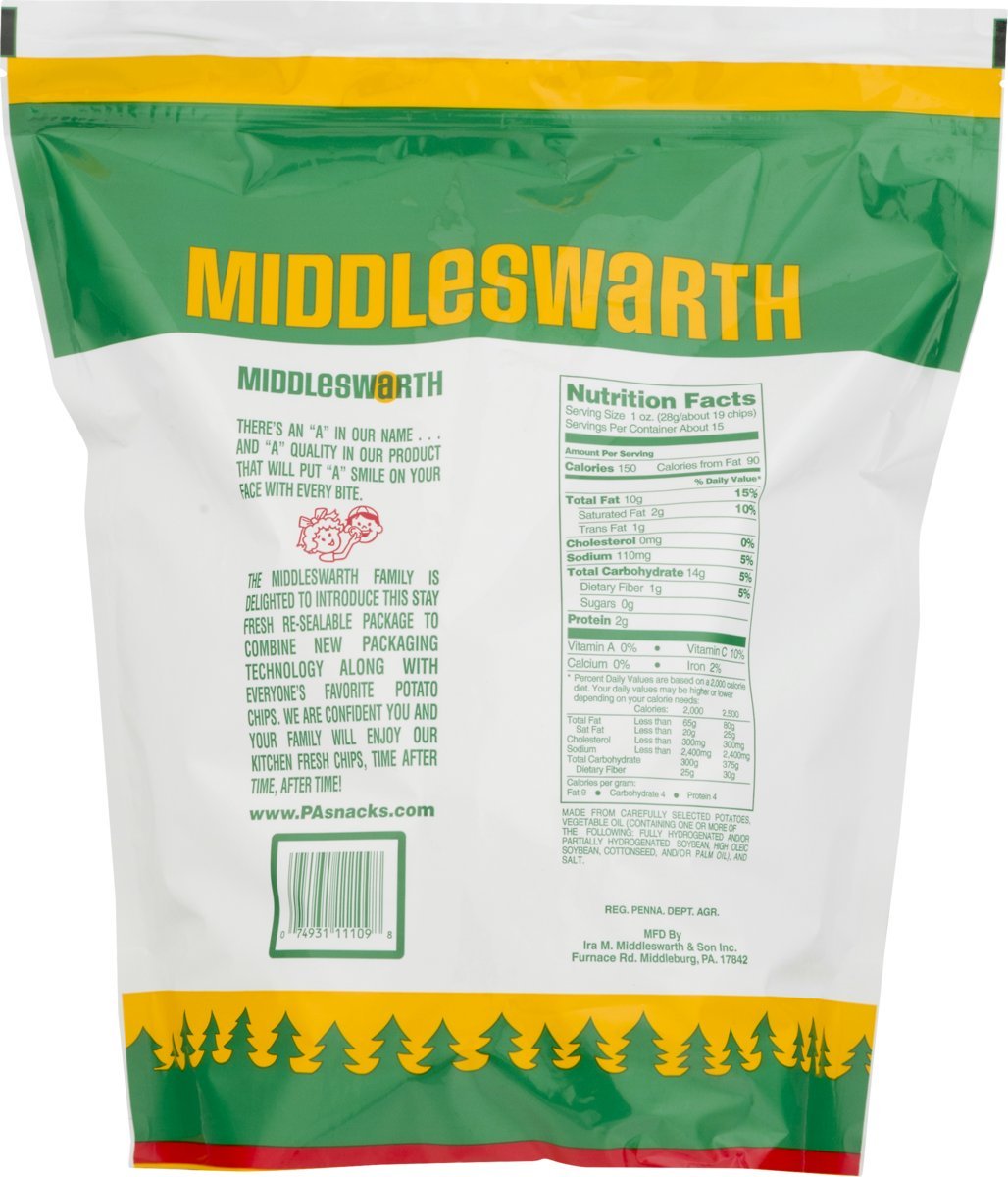 There's an ''a'' in our name ... and ''a'' quality in our product that will put ''a'' smile on your face with every bite. The Middleswarth family is delighted to introduce this stay fresh resealable package to combine new packaging technology along with everyone's favorite potato chips. We are confident you and your family will enjoy our kitchen fresh chips, time after time, after time!
