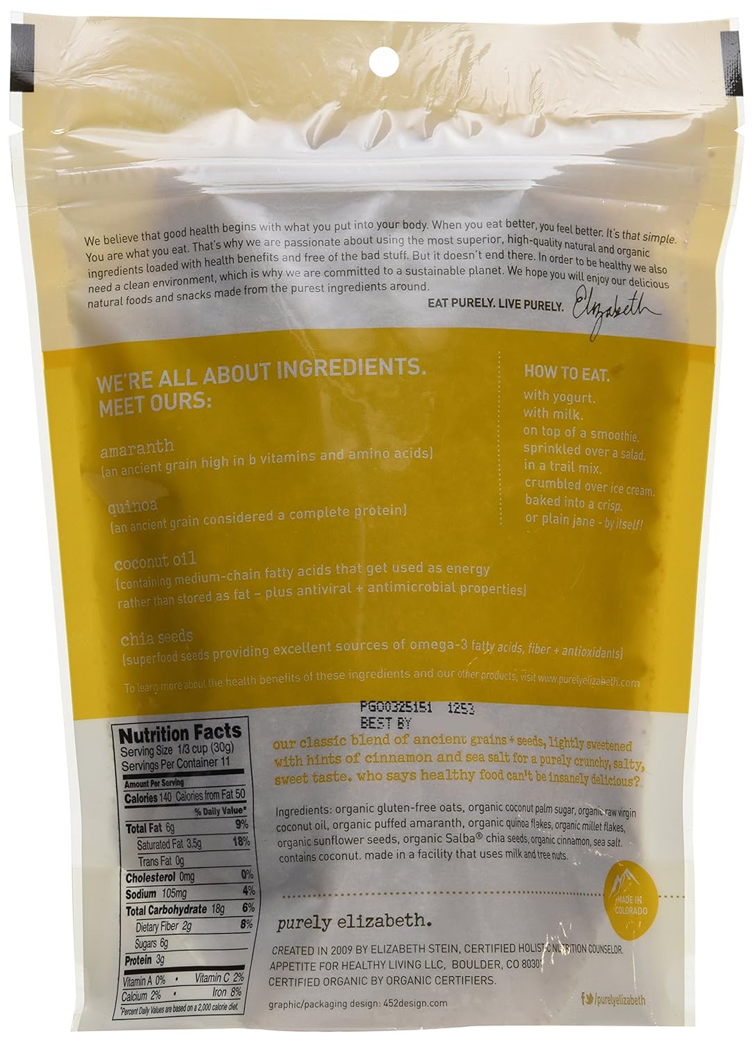 Product Description Purely Elizabeth Ancient Grain Granola Cereal Original, 12 Ounce (Pack of 6) From the Manufacturer Purely Elizabeth Ancient Grain Granola Cereal Original, 12 Ounce (Pack of 6)