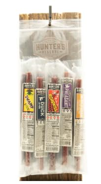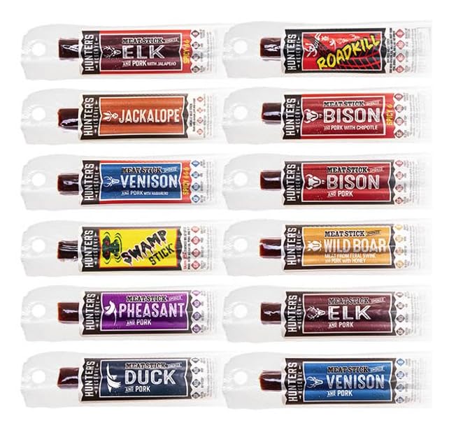 Product details Treat your taste buds to a carnivorous safari and bite into Wild Game Meat Sticks. Each of the dozen meat sticks contains a blend of wild game, pork, and spices (and occasional heat provided by piquant peppers) to create a unique taste you're sure to want to snap into. Alongside irreverent flavors like jackalope, roadkill, and swamp stick, you'll find classics like elk and bison and even poultry such as duck and pheasant. The collection of cured meats represents an entire zoo for your belly. Features & specs A dozen smoked sausage sticks made from a menagerie of meats Includes 12 meat sticks in different flavors Flavors: spicy venison (and pork with habanero), spicy elk (and pork with jalapeño), spicy bison (and pork with chipotle), bison (and pork), venison (and pork), elk (and pork), wild boar (meat from feral swine and pork with honey), duck (and pork), swamp stick (cajun-style alligator with pork and beef), jackalope (venison, pork, and rabbit), pheasant (and pork), roadkill (venison, elk, wild boar, pork, pheasant, and rabbit) Gluten-, nitrite-, and MSG-free 8g of protein per stick Made in the USA This item cannot be shipped outside the US. Note: Flavors may change from what is shown based on availability. Salivating sausages Mmmmm! Meat! Up your snacking game with Wild Game Meat Sticks, a selection of sausages made with exotic animals. The menagerie of meat includes unique flavors like pheasant, rabbit, and alligator with delicious game mainstays like venison and elk. Snap into something a bit more special than gas station fare and hunt for your favorite flavor in this 12-pack! Gourmet meat snacks! Taste the taxonomy This selection of meat sticks includes twelve different flavors that pair unique animal meats with delicious spices: spicy venison (and pork with habanero), spicy elk (and pork with jalapeño), spicy bison (and pork with chipotle), bison (and pork), venison (and pork), elk (and pork), wild boar (meat from feral swine and pork w