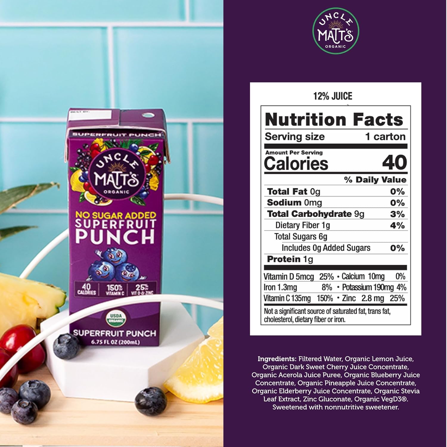 Uncle Matt’s Organic No Sugar Added Superfruit Punch Juice Boxes for Kids with Vitamin C, D, Zinc, Only 40 calories, 32 pack of 6.75 oz Boxes