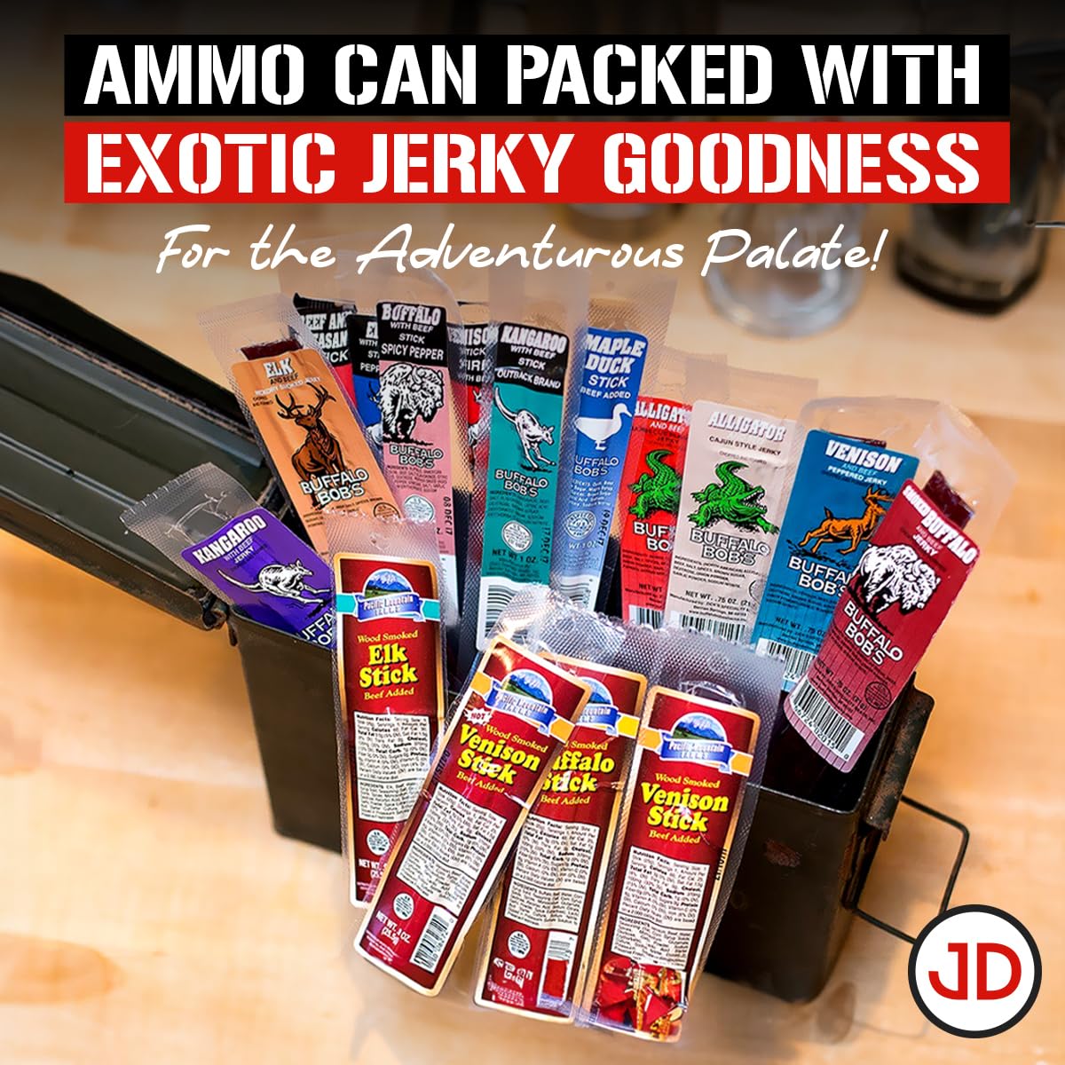 Taste Adventure:This gift is sure to please any palette with its variety of flavors! From sweet & spicy to teriyaki, and many more, you can rest assured that there is something for everyone. This is great for any occasion when you have several people to please, as the variety of flavors allows you to accommodate different tastes. With the 16-piece exotic jerky can gift for him, you can be sure that everyone will be satisfied.Durable Ammo Cans:This gift is a great option for those who want a long-lasting present. The ammo cans used are of quality as they are reclaimed from the military and are guaranteed to last for many years. If you are looking for a gift that will remain in great condition throughout the years, this is a good option. It is also great for those who are looking for something special and unique, as the ammo cans add a unique touch to the gift. With this gift, your recipient can be sure of its quality and staying power.Stand Out Gift:This gift is great for those occasions when you want to show someone special just how much you care. The 16-piece exotic jerky can gift is a one-of-a-kind present that is sure to make a lasting impression. This thoughtfully chosen gift allows you to express your heartfelt appreciation for the recipient’s friendship and loyalty. Whether it’s a birthday, anniversary, or just to say thank you, this unique gift will show them how much you care.Item Features:-16 Pieces of Exotic Jerky-Ammo Can be Reclaimed from the Military-Great Gift for Him-Packed with Delicious BB Sticks-Unique & Thoughtful Present