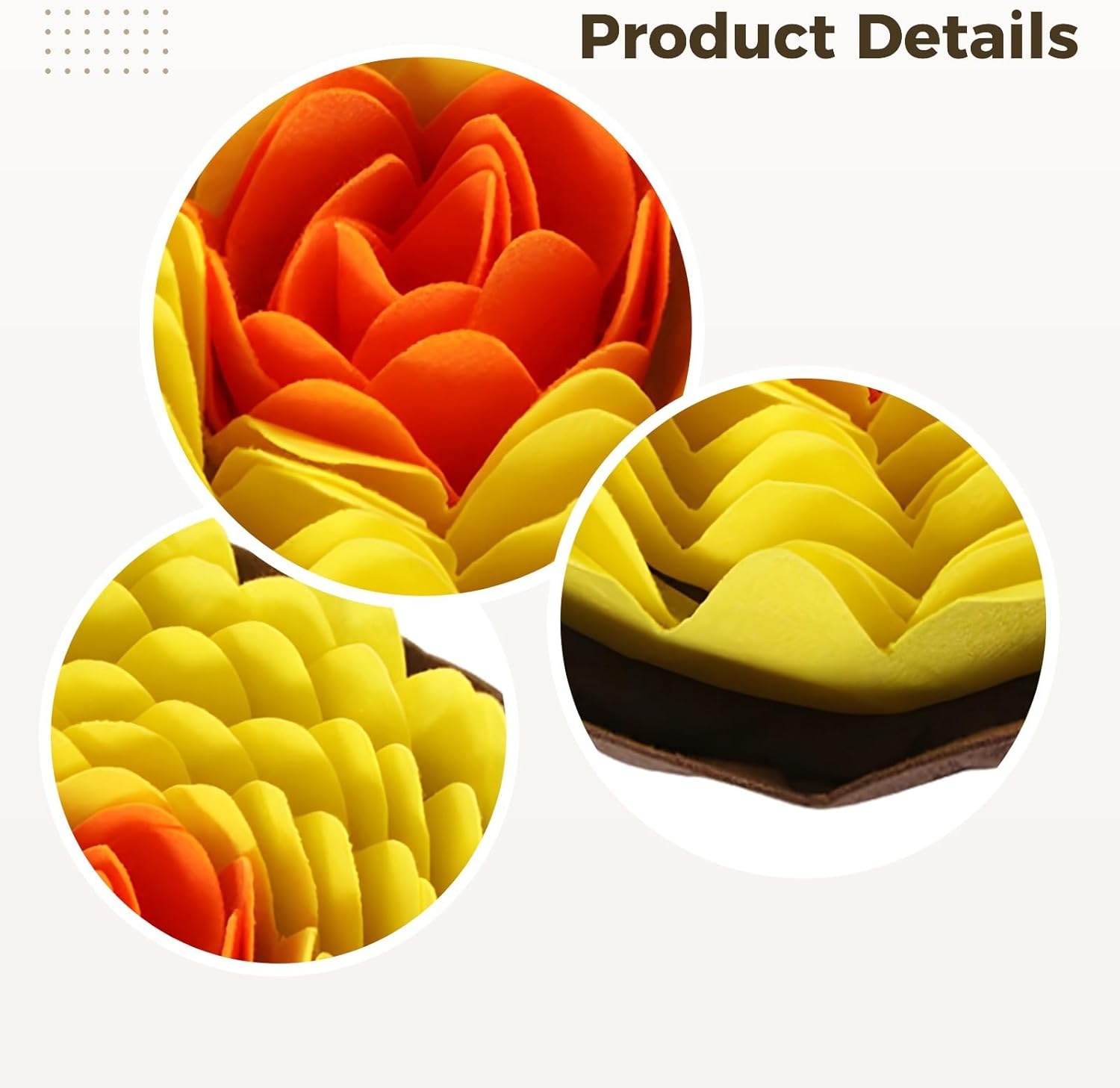 Puppy puzzle toy color: Yellow orange, green brown Interactive feed game material: Felt Dog snuffle mat size: L*W about: 27*27cm(10.63*10.63in) Package includes: 1 x Dog snuffle mat Note: - Only 1 piece of pet snuffle mat is included. - The snacks, pet and other treats are not included. - Please refer to the measurement. Tiny measuring error is allowable in normal range. - There might be a little color difference due to the monitor, camera or other factors, please refer to the physical item.