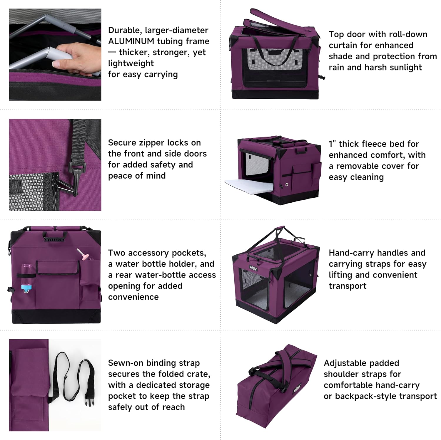 Provide your dog with a comfortable, secure, and travel-ready space with the EliteField 4-Door Folding Soft Dog Crate with Top Curtain, Carrying Bag, and Fleece Bed. Designed for both indoor and outdoor use, this versatile soft crate combines spacious comfort, durable construction, and convenient portability — ideal for home, travel, camping, shows, and everyday use. Built wider and taller than many standard soft crates, the 4-door design creates a more spacious and relaxing resting environment for your pet. The crate arrives fully assembled and can be set up or folded down easily without tools, making it convenient at home or on the go. The reinforced frame is constructed from thick aluminum tubing for strength and stability while remaining lighter than traditional steel frames. Combined with durable 600D fabric and breathable hex mesh panels, the crate provides excellent ventilation, visibility, and long-lasting performance. Four mesh doors — top, front, and two sides — offer flexible access and airflow. The top door includes a roll-down curtain for shade and protection from rain or harsh sunlight. Zipper locks enhance safety, while two accessory pockets, a water bottle holder, and a rear access opening add convenience. The removable crate cover and fleece bed cover are washable for easy cleaning. Designed with travel in mind, the crate includes a free carrying bag and fleece bed. Hand-carry handles and straps allow easy lifting, while the carrying bag features adjustable padded shoulder straps for both hand carrying and backpack-style transport. The crate folds into two compact shapes — flat for hand carrying and square for backpack transport — making storage and travel simple and efficient. For added peace of mind, every EliteField soft dog crate is backed by a 2-year manufacturer’s warranty, along with our quality guarantee, money-back guarantee, and customer satisfaction commitment.