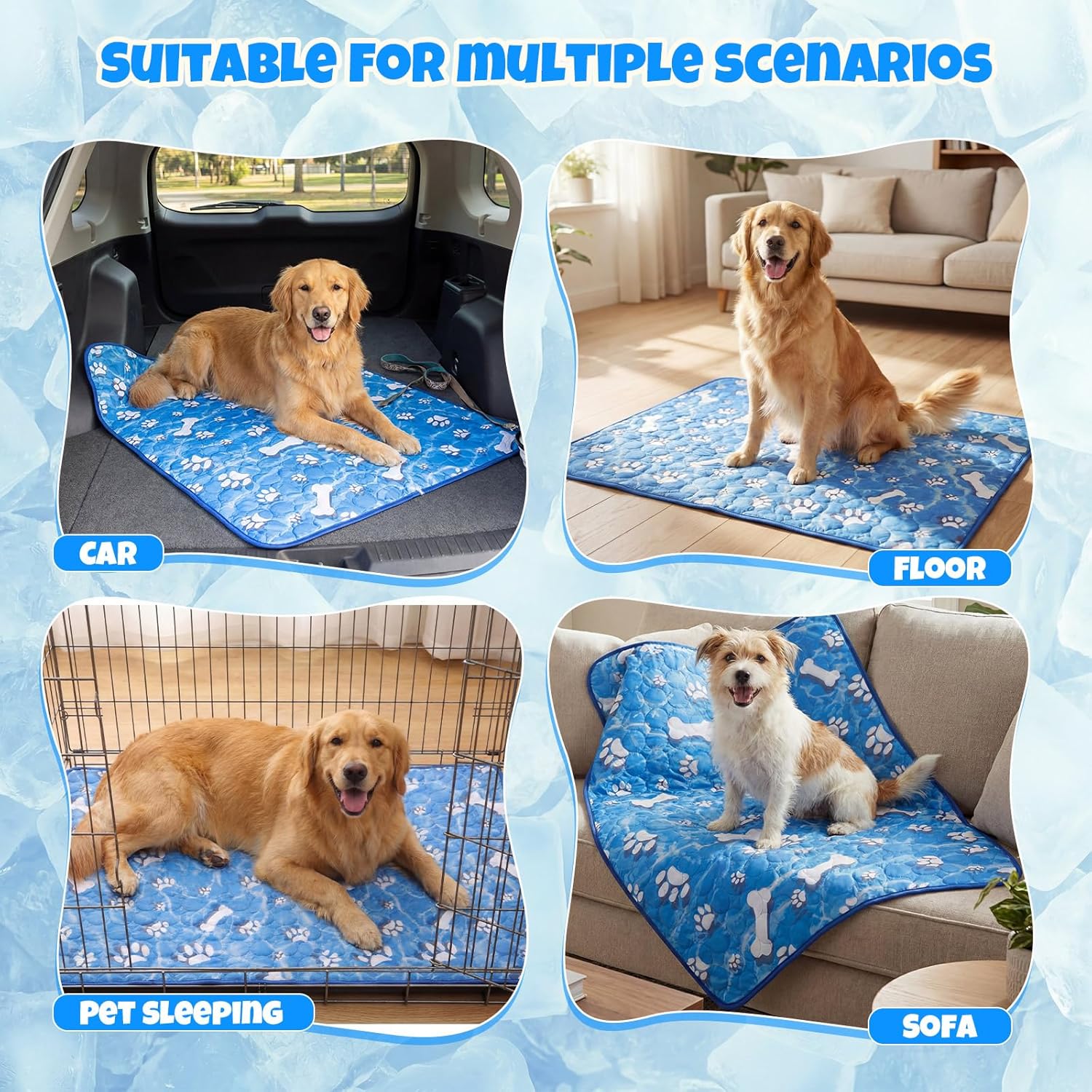 Features: Suitable for various usage scenarios, it can be placed in kennels, sofas, and floors at home, allowing pets to enjoy coolness anywhere. When traveling, it can be placed in car seats to relieve pets from stuffiness and discomfort while riding. It can also be easily spread and used during travel, fully meeting the resting needs of pets in different scenarios and becoming an cool companion for pets in summer The three layer composite structure design allows pets to enjoy coolness and a soft and comfortable resting experience in summer Specifications: Material: fabrics Color: blue Size: length 44 x 32 inches (112 cm in length and 81 cm in width) Package includes: 4 X Extra large dog cooling mat Notes: Manual measurement, please allow slight errors on size. The color may exist a slight difference due to different screen displays. Small items are included, please keep them away from pets in case of choking risk. Before purchase, confirm whether the product size is suitable for your pet, and observe the pet's reaction when using. Please remove the product in time if there is any discomfort