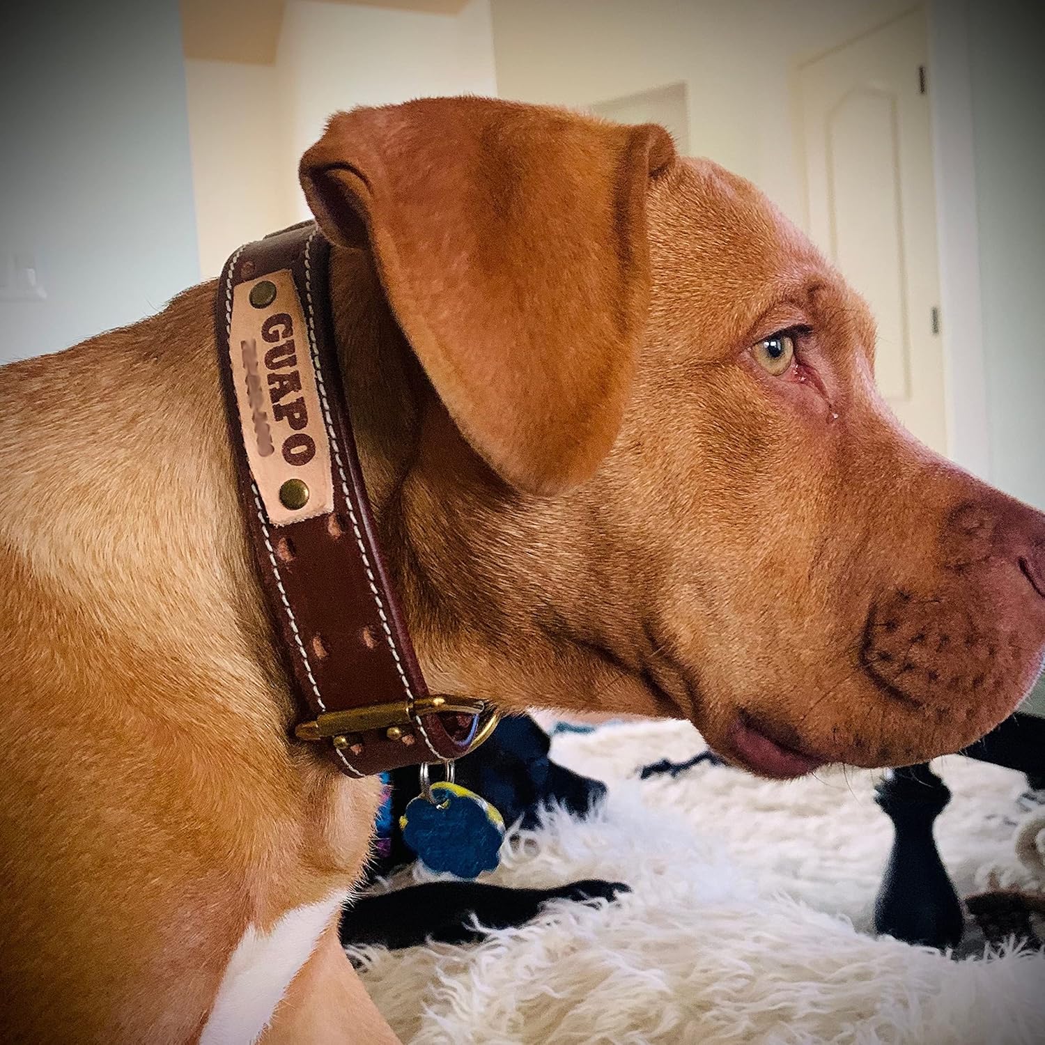 The 'Pawficer' breathable heavy duty personalized dog collar is designed for active and outdoor dogs. The collar is made with thick cowhide to ensure it lasts much longer than standard collars with your young, active or chewy companion. The design has holes throughout the collar to allow for easy air flow around the thick leather. The center ring allows for outdoor safety if your loved one gets stuck in a bush or in tree branches. It may also be used for training with martingale chain attachments. The double pin roller buckle and rings are made with heavy duty brass. This handmade collar is available in sizes S, M, L and XL. Please measure your dog's actual neck size with a measuring tape and refer to the size chart image to order the correct size. The Small and Medium sizes are 1 inch wide and the Large and XL sizes are 1.25 inch wide. The Pawficer collar can be personalized with your dog's name and additional info engraved on a natural color leather tag attached to the collar. The engravable area is about 1.5"x1/2" on the L and XL sizes, and 1"x3/8" on the S and M sizes. Please provide your dog's name and info by clicking the "Customize Now" button on top.