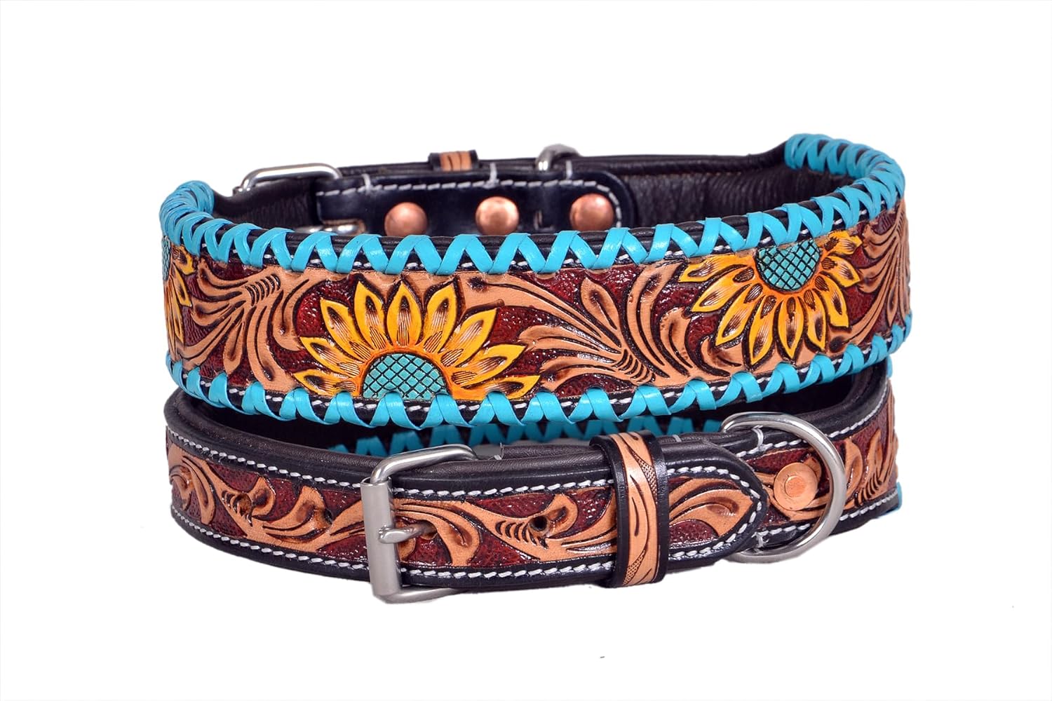 This Leather dog collar is artistically hand crafted, Hand Painted and hand finished by Artisans to give it a unique look and style. The collar is made up of very high quality genuine full grain cow leather. It has a padded leather lining for your dog comfort. Best quality Cow leather and very high-quality silver finish stainless steel hardware is used in this collar to ensure that the collar is sturdy and last a long time.