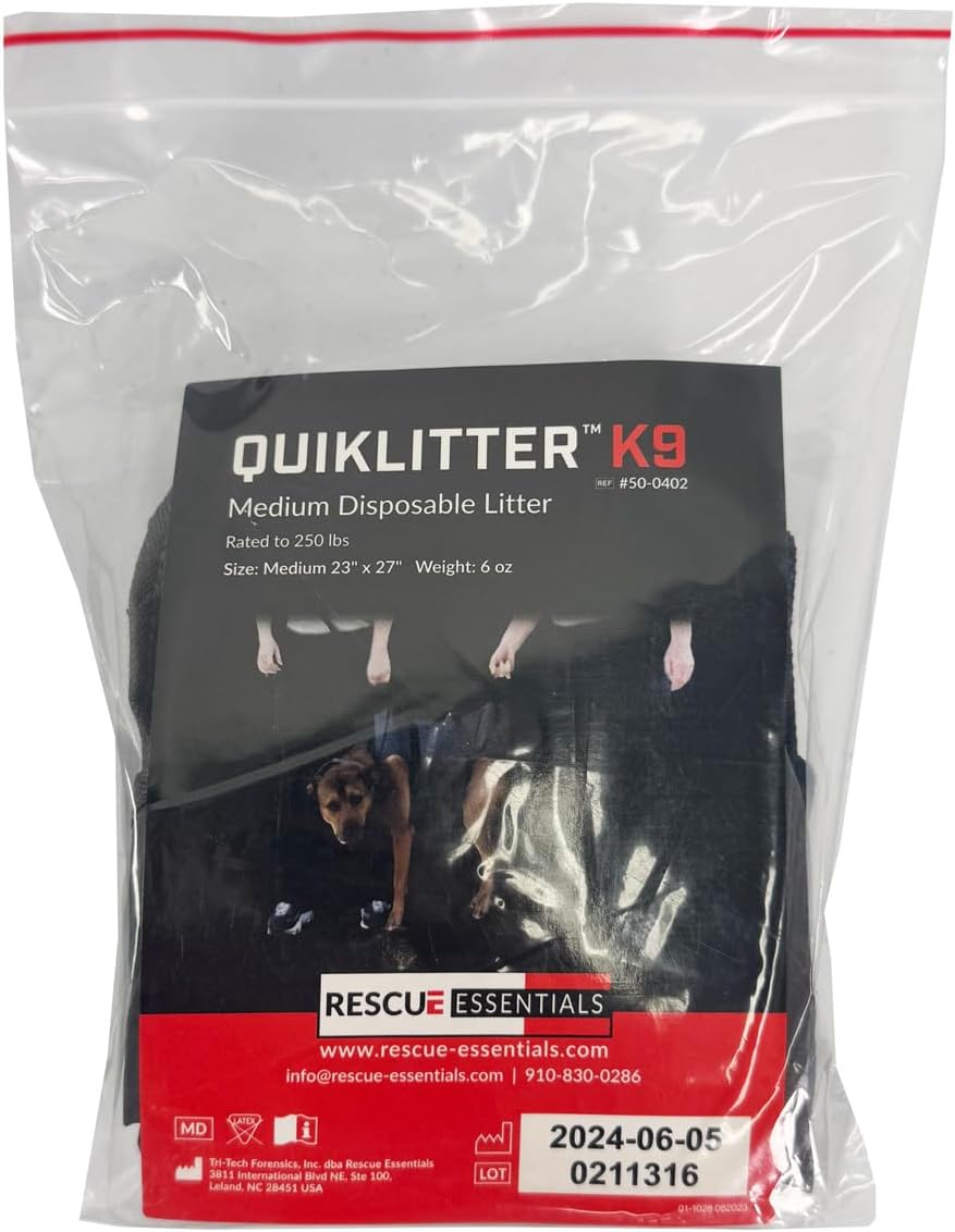 The lightweight K9 Quiklitter is designed for easily transporting injured canines. The four leg holes help to distribute a dog's weight evenly, and the buckle keeps the Quiklitter secured during transport. The durable ripstop nylon will stand up to claws and supports even the heaviest dogs. Sizing Guide: Medium size typically works for dogs under 60 lbs. Large size typically works for dogs over 60 lbs. Please see chart below for actual dimensions.