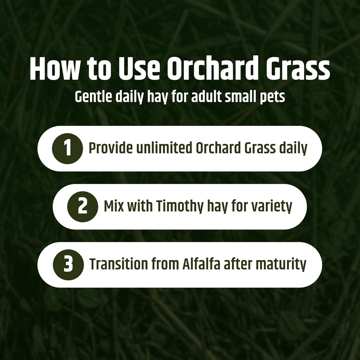 A Soft, Leafy Orchard Grass Hay Crafted for Daily Feeding RoutinesHigh Desert Orchard Grass Hay offers a naturally grown, additive free option created for rabbits, guinea pigs, chinchillas, and other small pets who thrive on grass based diets. Its soft leafy texture and mild aroma make it an appealing everyday hay that supports natural grazing and steady eating habits.What animals can enjoy orchard grass hay? This hay fits easily into the diets of rabbits, guinea pigs, chinchillas, hamsters, and other herbivorous pets. Its gentle texture makes it a preferred option for pets who enjoy softer leaves.Is this hay high in fiber? Orchard grass naturally contains fiber that supports regular chewing behavior. The long strands and leafy structure help maintain consistent hay intake throughout the day.Does orchard grass help with dental health? Hay encourages natural chewing, but it is not a dental treatment. Pets should have continuous access to hay to support their normal chewing activity.Can this hay be mixed with other types? Yes, many owners rotate or blend orchard grass with Timothy hay to offer variety in texture and aroma. Mixing hays can help maintain steady interest in daily feeding.How is this hay packaged? Each batch is hand packed in breathable boxes that help protect leaf structure and maintain freshness. This packaging also makes the hay simple to portion and store.Whether you are creating a daily feeding routine or offering variety alongside Timothy hay, High Desert Orchard Grass Hay provides a soft, appealing option for small animals. Its natural texture and careful handling make it an easy addition to long term diets for pets of many ages.