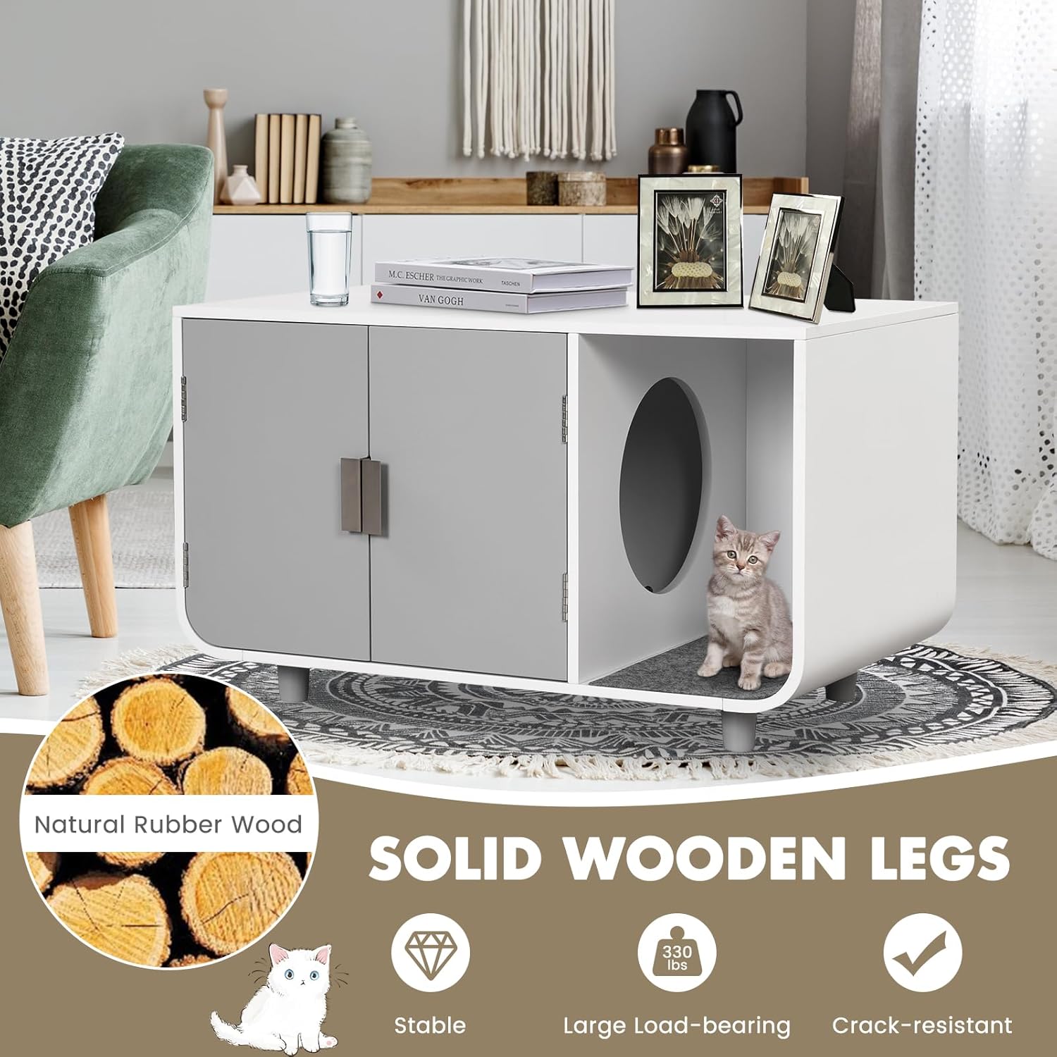 DescriptionChoose our cat litter box enclosure to reduce clutter and offer privacy for your cats! The enclosed litter box furniture comes with a double door cabinet to conceal cat litter box and let your cats poop privately. Meanwhile, the large cabinet and wide tabletop offer sufficient space to store kinds of items, making it a good choice as a spacious side table. Moreover, there is a inner access hole to allow your furry friends take to litter to the side compartments. There exists a removable mats for cleaning. Thus, with our large cat litter box enclosure, you will have no more worries about messy room. Supported by rubber wood legs, the cat house furniture can hold up to 150 lbs weight. And there are adjustable pads to add its stability. Thanks to chic and simple design, the cat litter box enclosure is not only a cozy cat house for your furry friends, but also a functional furniture to keep your room clean and organized.FeatureLarge double door cabinet can let your cats poop pleasantlyVersatile design makes it a functional side table and hidden cat washroomLarge inside entry and plush mats prevent cats from carrying cat litter everywhereSolid wooden legs is crack-resistant and stableAdjustable feet pads ensure its balance on uneven groundsMagnetic door catch allows for quiet door opening and closingModern style makes it a harmonious addition in your homeEasy to open the door with durable aluminum handleSpecificationColor: White+GreyMaterial: MDF, Rubber Wood, Aluminum AlloyOverall Size: 37” x 22” x 22.5”(L X W X H)Compartment Size: 21.5’’ x 12’’ x 18’’(L X W X H)Cabinet Size: 23.5’’ x 21.5’’ x 18’’(L X W)Plush Mat Size: 21’’ x 10’’(L X W X H)Access Hole: 12”(Dia.)Net Weight: 59 lbsTabletop Max Weight: 220 lbsCabinet Max Weight: 110 lbsPackage includes:1 x Cat Litter Box Enclosure1 x Instruction