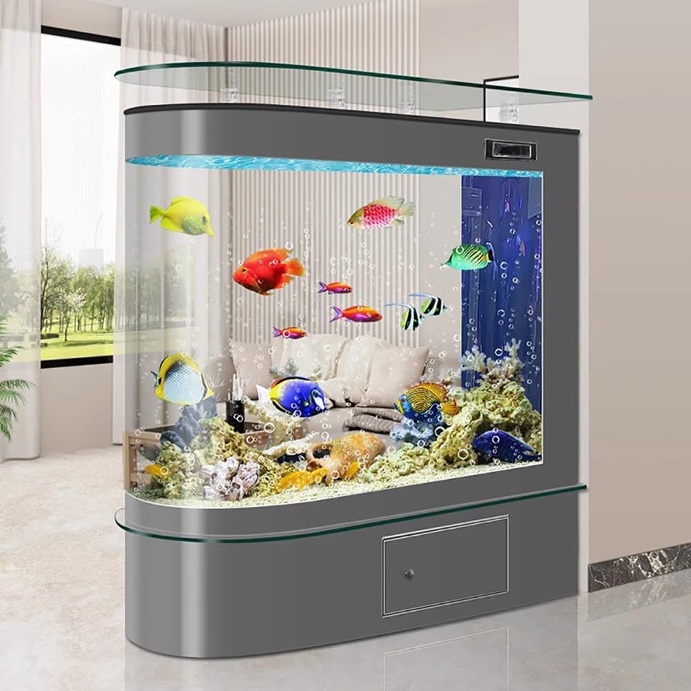 Note: Does not include fish or real plants. You will receive filter cotton, ceramic rings, air pump, heater, cleaning brush, LED light, water pump, activated carbon, artificial rock, air stone, and sea salt. Seaweed is also included. Become a professional fishkeeper with this sturdy aquarium that allows you to enjoy your fish's living environment from a 360° perspective while saving you home space. You don't need to sacrifice aquarium volume to save space! Furthermore, you can freely create vertical landscaping and aquascaping designs.Colors: Gray, White, BlackMaterial: Acrylic + GlassVoltage: 110-220VPower: 40WDimensions: 100/110/120/130*40*138CMWeight: 120-180kgPackage Contents: Aquarium * 1