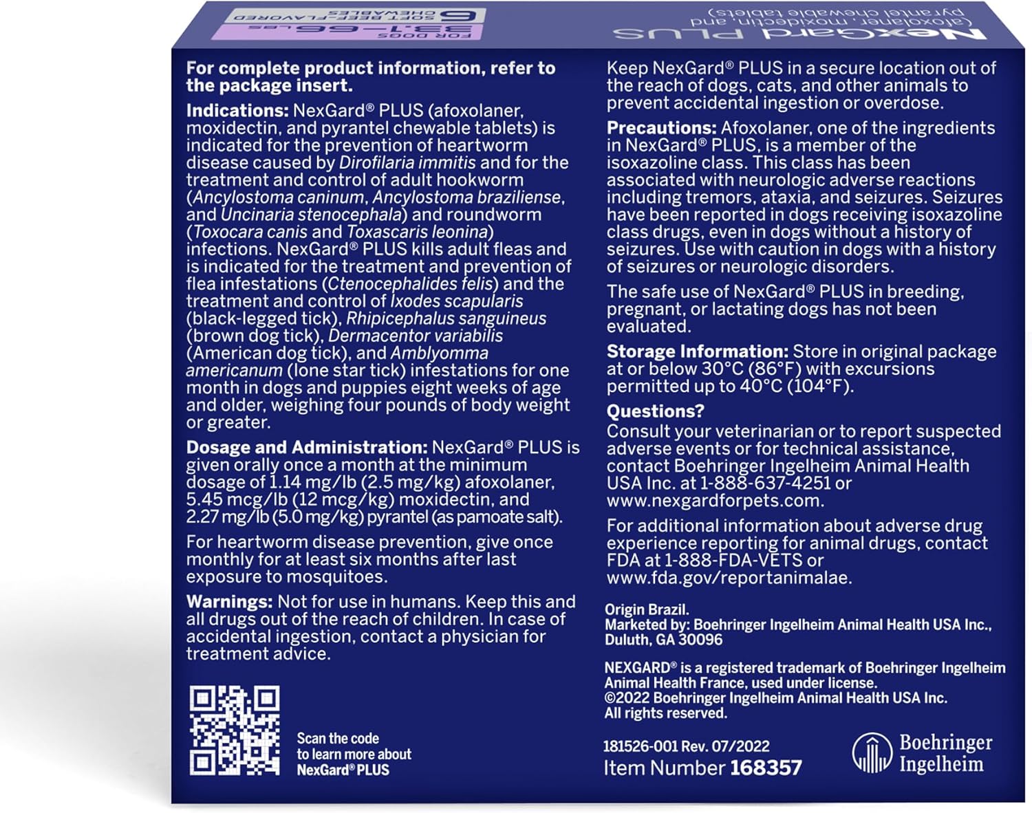 | Directions | Nexgard PLUS should be given orally as directed by your veterinarian. This medication should be administered at monthly (every 30 day) intervals, year-round to guarantee protection from heartworms, fleas, ticks and intestinal parasites in dogs. For dogs over 132 lbs, use the appropriate combination of these Chewables to ensure complete protection against fleas and ticks. Remove only 1 tablet at a time from the foil-backed blister card and return the card to the box to protect from light. |
