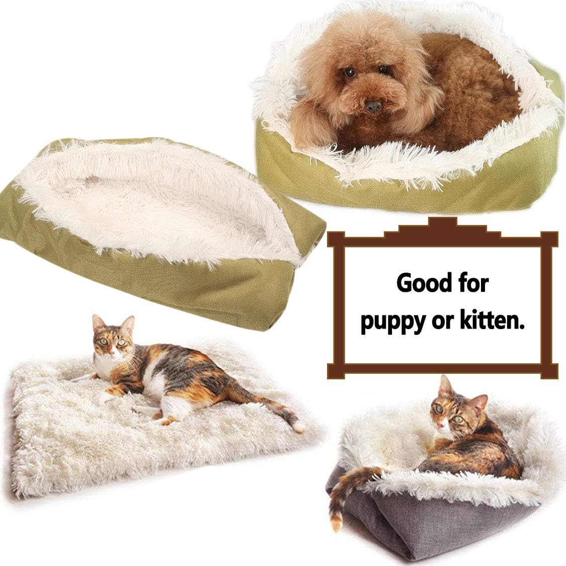 Dogs spend an average of 14 hours a day sleeping; cats sleep more than 16 hours a day; puppy and kitten need to get many sleep every day for their growing up requirement. Thus, choosing a suitable bed for them becomes quire important, especially after a long day playing and walking, your exhausted dog will eagerly fall into the cozy bed. With the ultra soft fabric surface material and high-quality PP cotton for internal filling, this pet bed provides the best sleeping experience for your furry friends. And its raised side design support pet's head and neck that will help your friends sleep well.When it expanded by unbuttoning, a comfortable rug will show up, a warm and cozy place where the pet will always rolled his body over on the rug.Material: PP cotton, long fabric, Liner fabric. Machine washable.Size S: Expanded, length*width in 27.5x19.6 inch/70x50 cm; Folded, approximately length*width*height in 17.3x9.4x5.1 inch/44x24x13 cm.Size M: Expanded, lengthxwidth in 31.4x23.5 inch/80x60 cm; Folded, approximately lengthxwidthxheight in 25.1x9.4x5.1 inch/56x36x13 cm.Size L: Expanded, lengthxwidth in 35.3x27.5 inch/90x70 cm; Folded, approximately lengthxwidthxheight in 25.1x9.4x5.1 inch/64x44x13 cm.Note:Before placing an order, please notice that the item color displayed in the pictures may be slightly different from the real object, due to different monitors or other factors.And please allow 0.3-0.9inch/1-3cm error due to manual measurement.Thanks for your understanding.