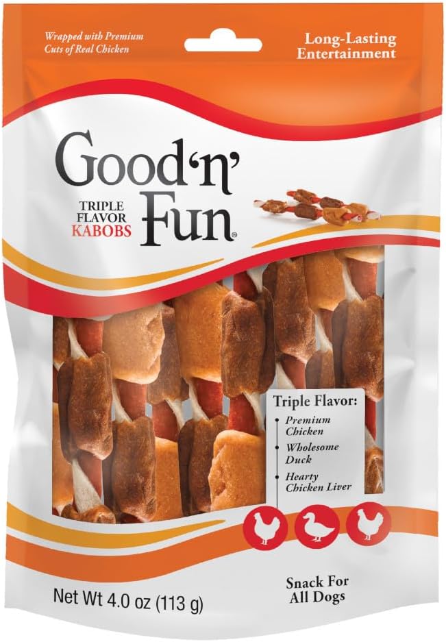 Good ‘n’ Fun brand offers a tasty smorgasbord of flavors that dogs love. These delicious chews are made from the finest ingredients, including real beef hide and real chicken, to create truly delightful, long-lasting treats your dog will love.Tails will be wagging for flavor-packed Good ‘n’ Fun Triple Flavor Kabobs, made with a savory combination of five flavors that dogs love most. These delicious chew treats are made from the finest pork hide and rawhide, then wrapped with real, savory chicken, wholesome duck and hearty chicken liver flavor to create a truly delightful, long-lasting rawhide treat your dog will love. A good source of protein, Good ‘n’ Fun Triple Flavor Kabobs are a healthy and delicious way to satisfy your dog’s natural urge to chew. The natural action of chewing also helps reduce tartar buildup and remove plaque.Give your dog up to one Good ‘n’ Fun Triple Flavor Kabob rawhide chew per day. For supervised consumption only. Select a chew slightly larger than your pet’s mouth. Discard chunks or fragments. Always provide plenty of fresh drinking water and visit your veterinarian regularly.