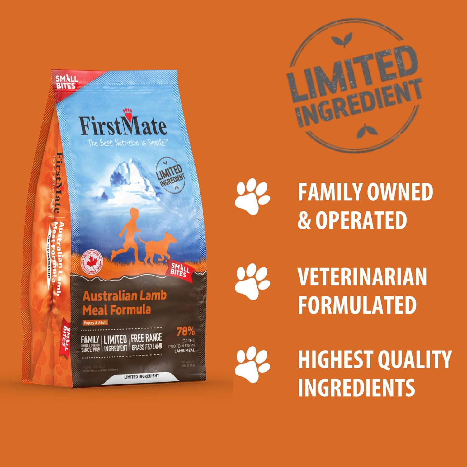 FirstMate Australian Lamb Meal Limited Ingredient Diet Small Bites Dry Dog Food is a veterinarian formulated dry dog food designed for dogs that benefit from a smaller kibble size and simplified nutrition. This dog food features a small bite kibble ideal for small breed dogs, puppies, senior dogs, and dogs that struggle with larger kibble, helping dogs chew comfortably and eat with confidence. The grass-fed Australian lamb meal recipe provides a single animal protein source, making this dog food a great option for dogs with food sensitivities or dogs transitioning to a limited ingredient dog food. This grain free dog food contains no corn, wheat, soy, peas, or by-products. Potatoes supply digestible carbohydrates that help fuel daily activity without upsetting digestion. The smaller kibble helps many dogs digest food more efficiently while supporting steady stool quality and improved feeding consistency. Dog owners looking for sensitive stomach dog food often prefer smaller kibble because dogs chew more thoroughly before swallowing. Blueberries, cranberries, and raspberries provide natural antioxidants that support immune health, skin condition, and urinary tract function in dogs. The high percentage of animal protein supports lean muscle maintenance and steady energy for puppies, adult dogs, and senior dogs. Because this veterinarian formulated dry dog food is complete and balanced for all life stages, dogs can stay on one consistent dog food long term. FirstMate manufactures this dry dog food in their own Canadian facility to ensure strict quality control and responsible sourcing. This dog food contains no artificial preservatives, colors, or flavors and no added hormones or antibiotics. Whether your dog needs a small kibble dog food, sensitive stomach dog food, or limited ingredient lamb dog food, this small bites dry dog food delivers reliable nutrition and comfortable eating in every bowl of dog food.