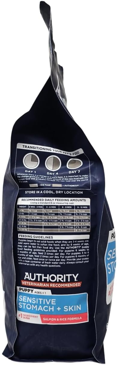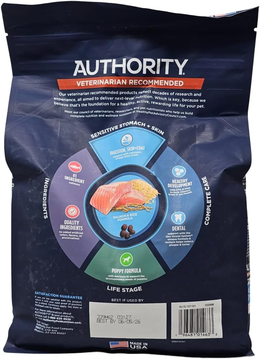 Formulated for puppies under the age of 1, Authority sensitive stomach and skin dry food comes in a tasty salmon and rice formula.