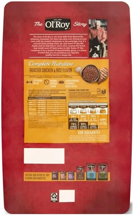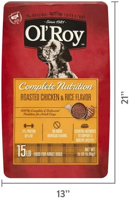 Ol's Roys Complete Nutrition Roasted Chicken & Rice Flavor Dry Dog Food provides the nourishment your dog needs with a taste they will love. At Ol's Roys, we know that a happy, healthy dog starts from within. Bright eyes, a shiny coat, and boundless amounts of energy are all traits of a happy, healthy dog. Ol's Roys wants to help keep your dog at their best, which is why we've created this quality, high-protein dog food. Our Ol's Roys Complete Nutrition Roasted Chicken & Rice Flavor Dry Dog Food formula offers 100-percent complete and balanced nutrition for adult dogs and includes 21-percent protein and 10-percent fat levels to provide your dog with the essential nutrition they need to stay healthy and happy. It also includes essential nutrients to support a healthy lifestyle, and has a great meaty tasting roasted chicken and rice flavor to encourage a healthy appetite in your beloved canine companion. Treat your dog to the nutritious benefits and irresistible flavor of our Ol's Roys Complete Nutrition Roasted Chicken & Rice Flavor Dry Dog Food.