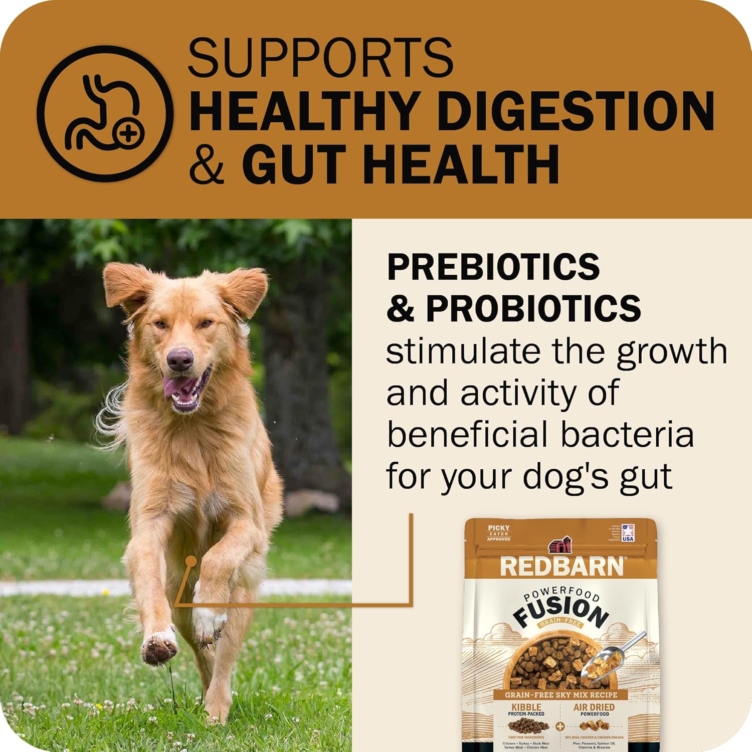 Give your dog the best of both worlds with Redbarn’s Powerfood Fusion. The convenience of 2 foods in 1 bag. Premium kibble boosted with our gently air dried Powerfood. Every bite is crafted with the first five ingredients from real animal proteins, then enhanced with nutrient-rich Air Dried Powerfood. Fusion is made with nutrient-rich ingredients for complete, balanced nutrition in every bite. Prebiotics & probiotics promote a healthy microbiome and strong digestion. Crunchy Air Dried Powerfood inclusions provide added protein, flavor and texture. The line is available in four varieties- Grain-free Land, Grain-free Sky, Whole-Grain Land and Whole-Grain Sky – catering to different dietary needs and preferences.
