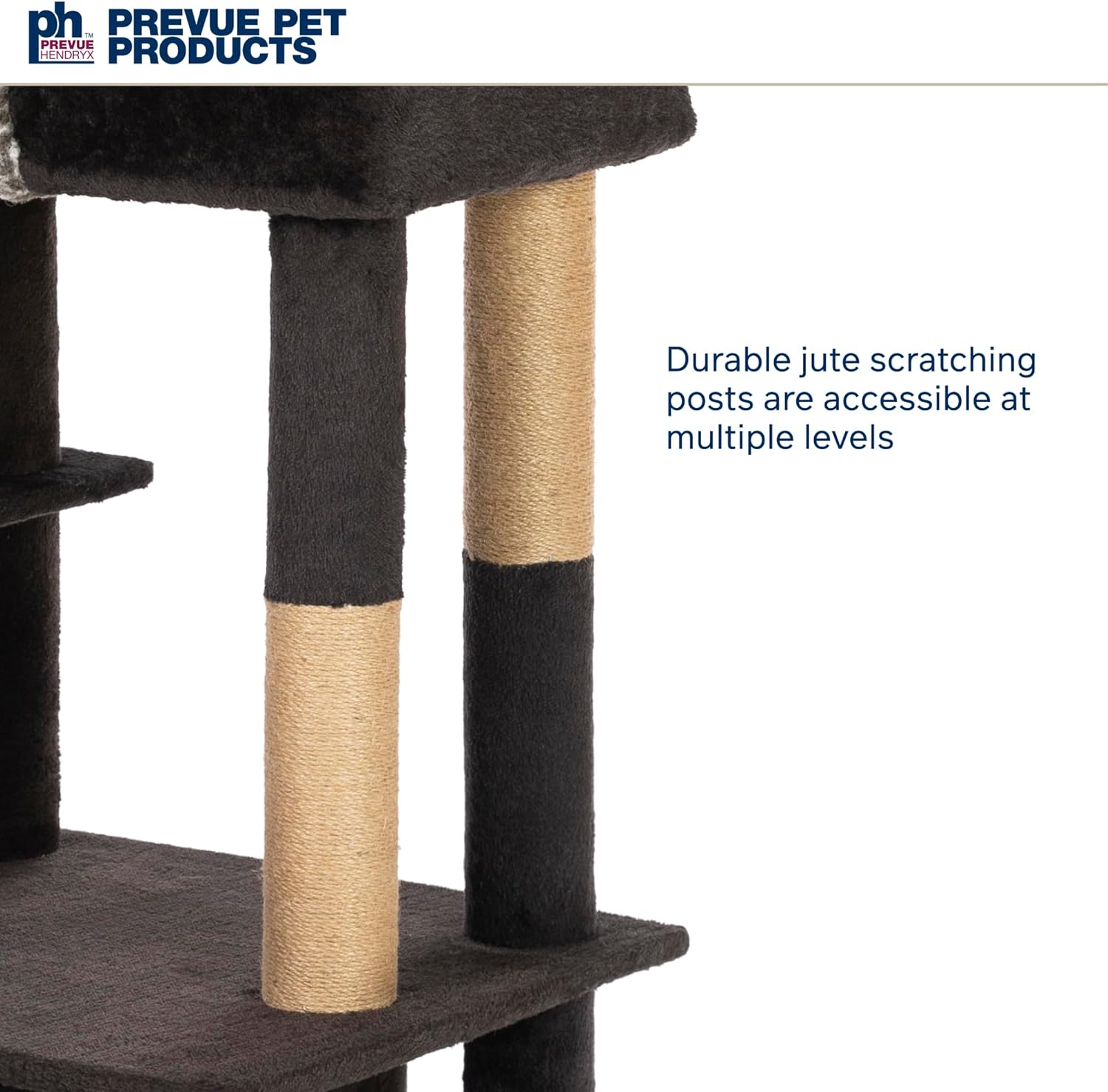 Prevue Pet Products Dark Tower in Black and Tan 7364 combines super soft, plush fabrics with durable jute to provide the perfect place for lounging, sleeping, scratching, hiding and playing. A luxurious bolstered day bed is a great spot for your kitten or cat to survey its surroundings or take a cat nap. One plush, dangling swat toy hangs playfully from the top platform. Two large hideaways are perfect for multiple kittens or a few large cats, making them feel secure and minimizing social stress. Durable scratching posts are covered in plush and jute - offering an appealing texture to cats, curbing inappropriate scratching behaviors and saving your sofa. A jumping platform is located on the second level, providing opportunities for pouncing and jumping. At almost 5’ tall, this cat tree utilizes vertical space and a compact footprint to save space in your home while offering your kitty plenty of options to play, sleep and lounge. Expertly designed cat furniture assembles easily and satisfies the needs of cats of all ages, sizes and activity levels. Measures 21 1/4’’ long, 19 1/4’’ wide and 59’’ high. The square base measures 21 1/4" long and 19 1/4’’ wide.