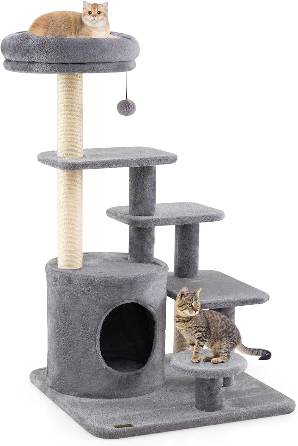 What We'd Like to Share:The multi-level cat tree is designed to meet all your feline friend's needs. The multi-level structure of the cat tower invites playful activity and promotes exercise for cats of all ages. Designed with your feline's comfort and needs in mind, the tall cat tree features specially spaced steps, making it easy for cats with mobility challenges to climb and explore. There's also an elevated perch for lounging with a clear view, and a roomy condo that makes the perfect hideout for a peaceful nap. Fully wrapped scratching posts are made of wear-resistant sisal rope, which support healthy claws and help deter unwanted scratching on your furniture. An engaging pompom with ball stimulates curiosity and encourages a cat's instinct to hunt. The extra large base enhances stability, while the soft plush fabric covering provides a welcoming place for cats to rest and play.Specifications:Color: Beige/GreyMaterial: Engineered Wood, Sisal, Plush FabricProduct Dimensions: 23" x 23" x 40"/ 58.5 x 58.5 x 102 cm(L x W x H)Condo Size: 13.5" x 13.5"/ 34 x 34 cm(L x W)Condo Entry Size: 8.5" x 6.5"/ 21 x 17 cm(L x W)Top Perch Diameter: 14"/36 cmNet Weight: 22.5 lbs/10 kgWeight Capacity of Each Layer: 33 lbs/15 kgPackage Includes:1 x Cat Tree1 x Instruction