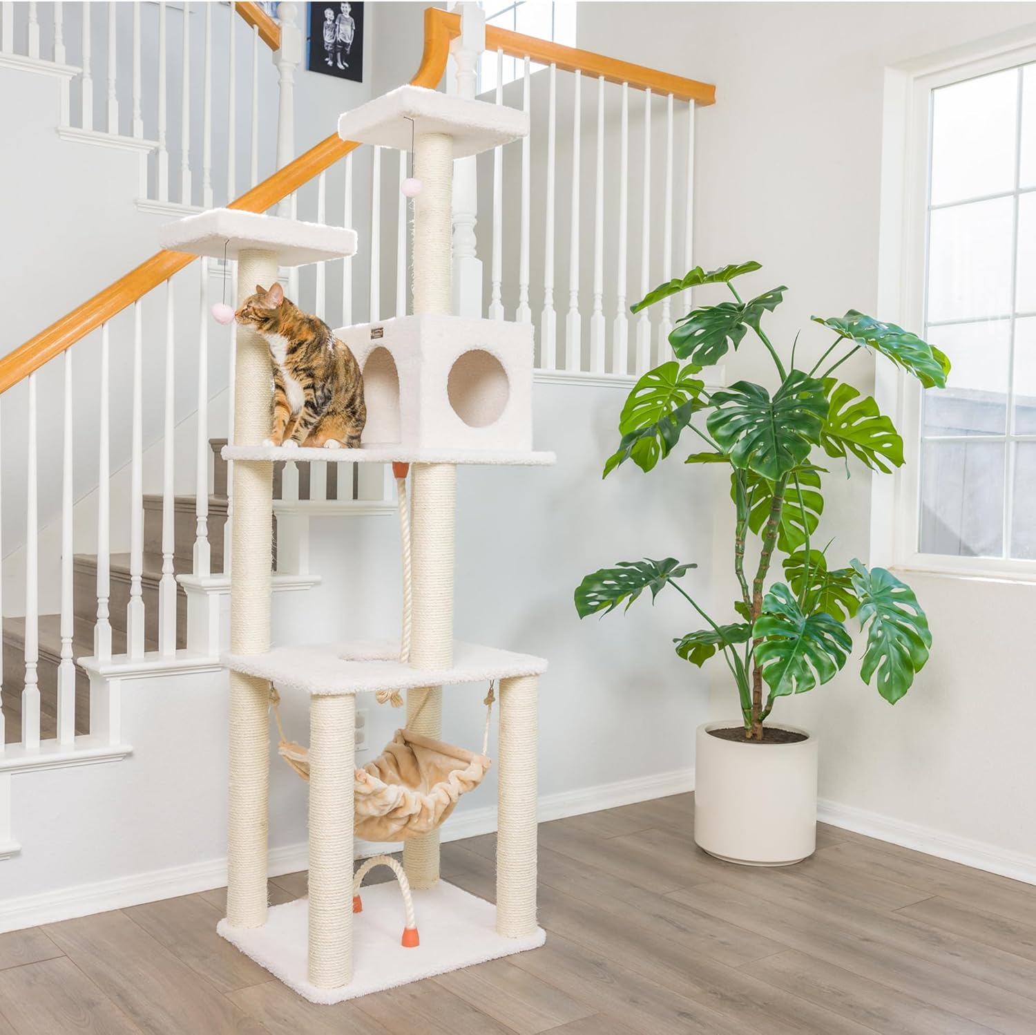 Treat your cats and kittens to the Armarkat B7301 Classic Cat Tree, a multi-functional play center designed for hours of entertainment and relaxation. Standing at 73 inches tall in an elegant ivory finish, this four-level cat tree features a fun rope swing, a cozy hammock, a private condo, and a spacious perch—offering the perfect spot for your feline to sit, observe their surroundings, and unwind. Features & Benefits: Four Levels of Fun: With four generously sized levels, including a rope swing, hammock, condo, and perch, this cat tree provides endless opportunities for climbing, playing, and lounging. Plush Comfort: Covered in high-density ivory faux fleece, offering a soft and warm surface your cat will love. All coverings are permanently adhered to the wood structure for lasting durability and are easy to clean. Sturdy Construction: Made from 15mm pressed wood, providing extra thickness and strength for reliable stability. The robust build helps the tree maintain its shape even with daily use. Natural Scratching Posts: All 3.5" diameter posts are securely wrapped with 100% natural, seasoned sisal rope, built to withstand years of scratching. Versatile Design: The elegant ivory finish complements a variety of home decors, blending seamlessly with your existing furniture. Product Specifications: Overall Height: 73" Post Diameter: 3.5" Base Dimensions: 24" x 20" Condo Dimensions: 16" (L) x 12" (W) x 12" (H) Perch Dimensions: 14" x 12" Maximum Holding Weight: 60 lbs Warranty: Six-month included Replacement Parts: Available from the manufacturer
