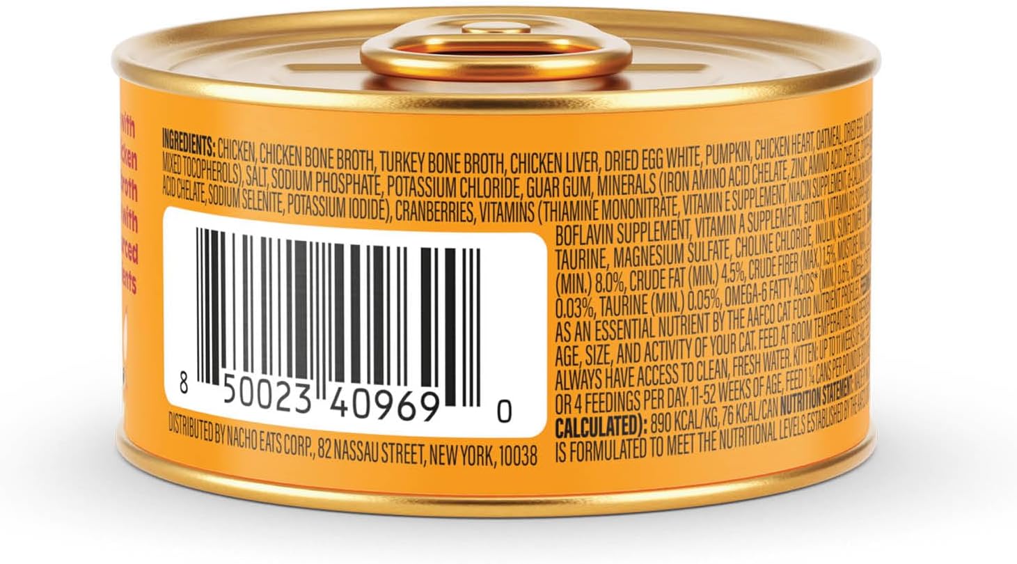 Revitalize your kitten’s growing flavor palate with Made by Nacho Chicken Recipe Minced Wet Kitten Food. Made in the USA, this minced meal consists of cage-free chicken, chicken hearts, and chicken livers. Plus, it is doused in a savory bone broth, which gives your kitten extra hydration as he feasts. This well-balanced wet cat food is chock full of nutrient-filled fruits, vegetables, and proteins that are infused with healthy vitamins, minerals, and antioxidants your little baby needs to grow big and strong. Your pal’s muscles, brain, vision, and digestive tract will benefit from the extra protein, prebiotics, DHA, and taurine. All of these powerhouse ingredients work to keep your precious kitty happy and healthy so he can play and cuddle with his favorite human servant all day long!