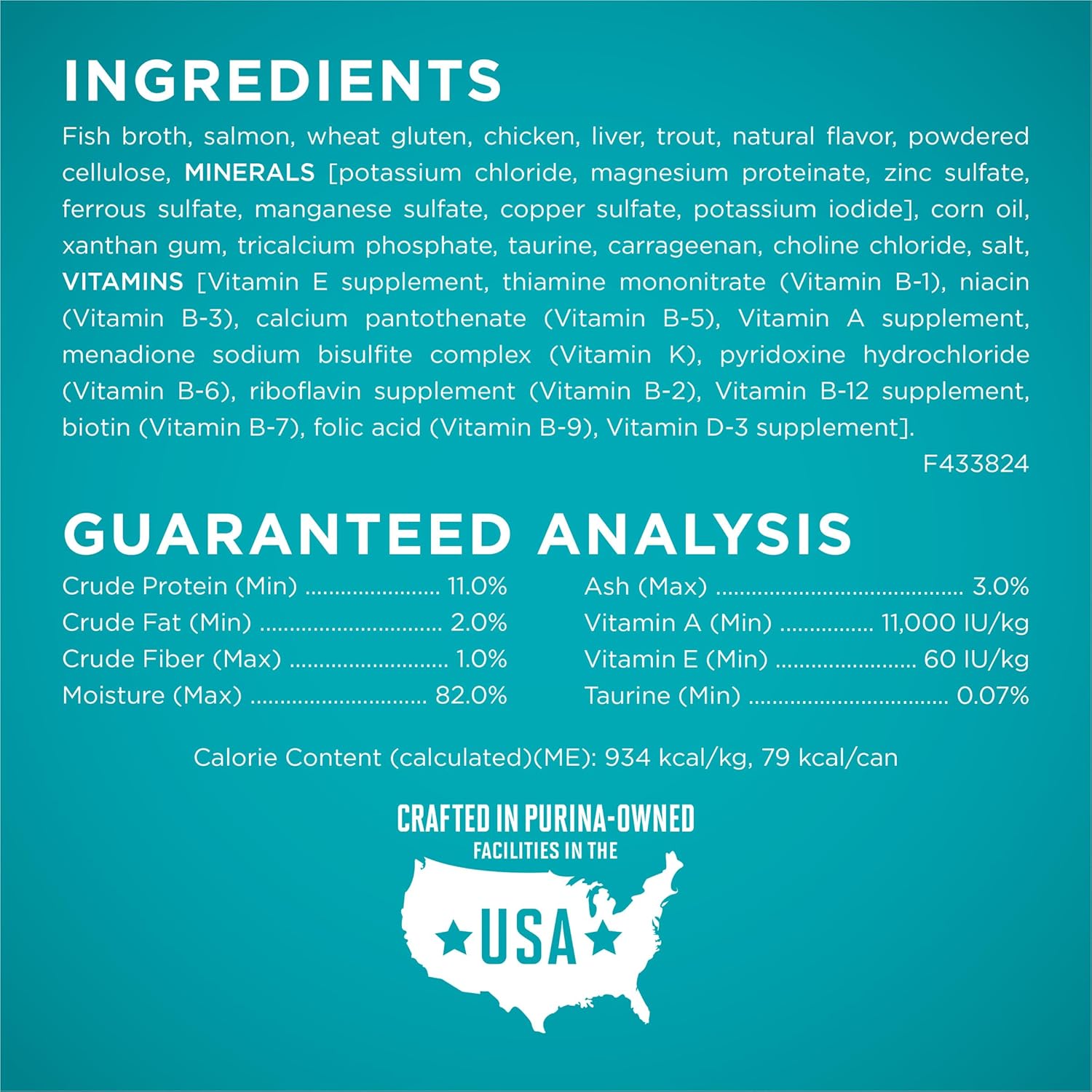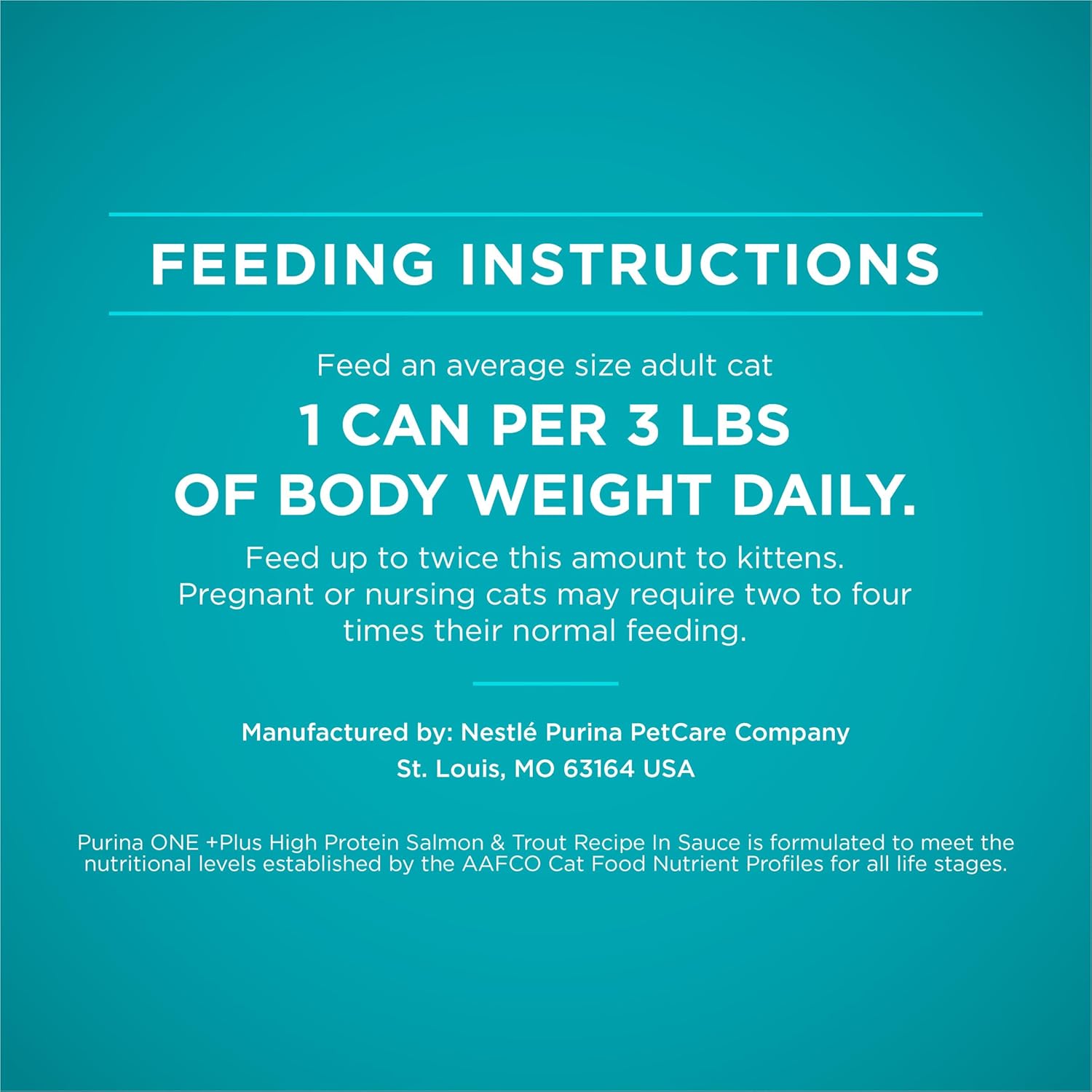 Please your cat's palate with Purina ONE True Instinct Salmon and Trout Recipe in Sauce natural wet cat food with added vitamins, minerals and nutrients. This delicious soft cat food is made with two protein flavors to tempt your cat's taste buds. Plus, every serving is high in protein to help support her strong muscles. Cats adore the tender texture and delectable seafood flavor of this wet food for cats. Our recipe provides 100 percent nutrition for all life stages and 0 percent fillers, which means that all the ingredients have a purpose. This moisture-rich cat food wet recipe helps support healthy hydration. Best of all, the natural cat food with added vitamins, minerals and nutrients delivers the purposeful nutrition she needs for lifelong whole-body health. Give your cat great taste from a veterinarian-recommended brand with this delectable Purina ONE True Instinct high protein cat food.