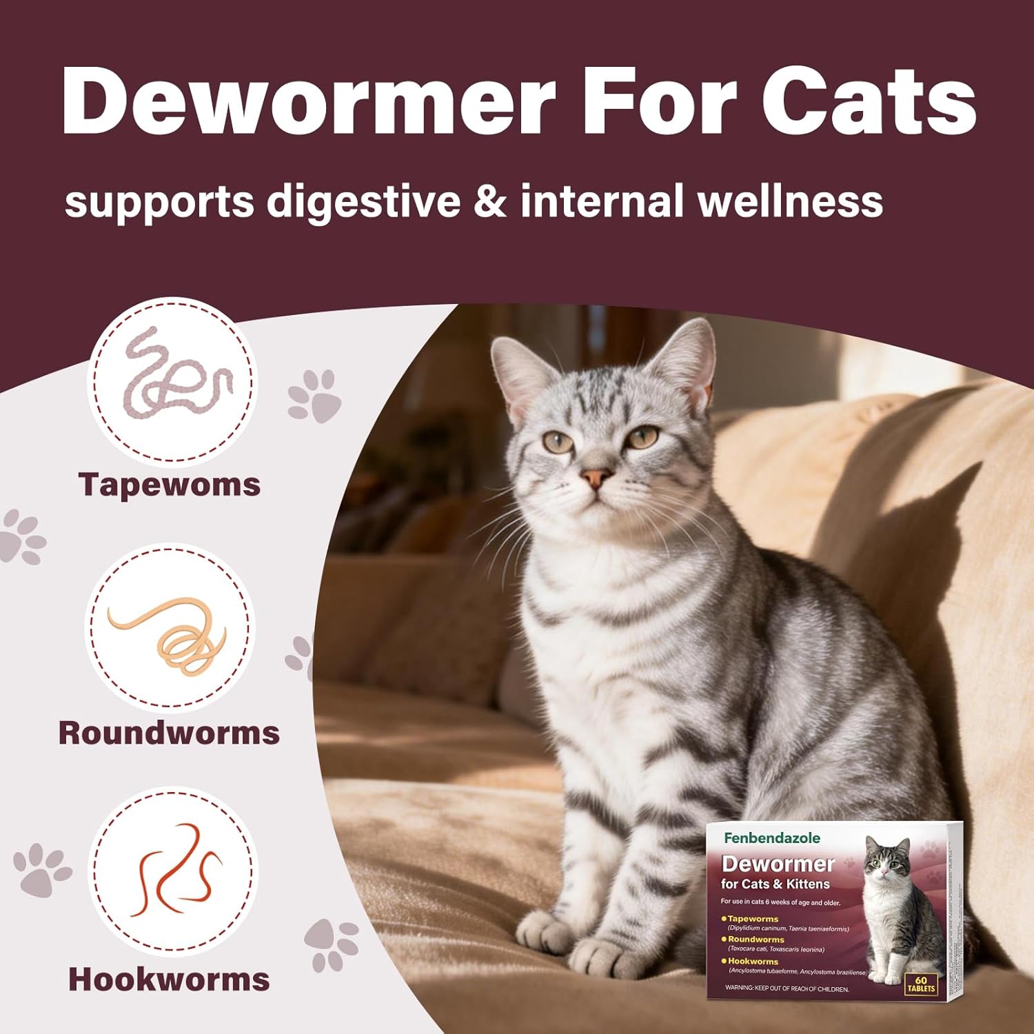 Dewormer for Cats & Kittens, Fenbendazole All-Worm Tablets for Tapeworms, Roundworms, Hookworms, 60 Count