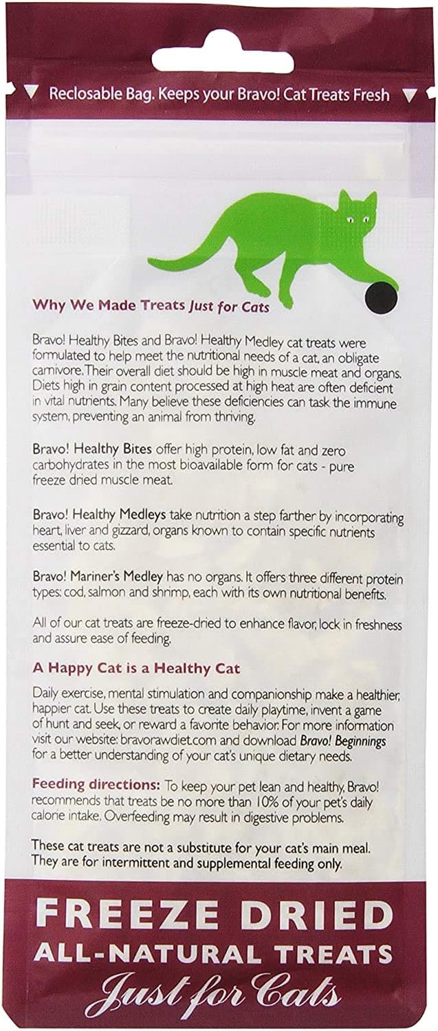 3 Pack Bravo! Healthy Bites are wholesome, all-natural treats made specially for your loving kitty. They are freeze-dried to enhance flavor and to lock in freshness. These grain-free treats are safe for cats with sensitive stomachs because they contain no additives or preservatives, just single-ingredient real turkey breast. Made in the USA.