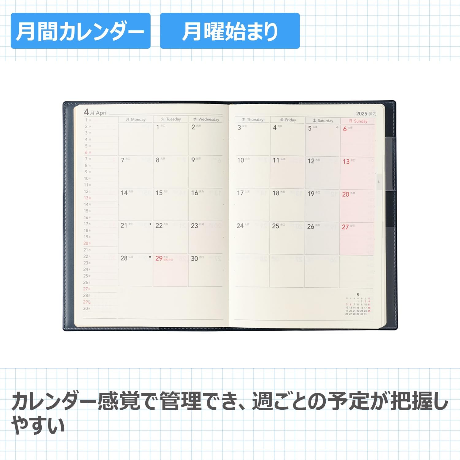■■ A simple notebook with plenty of space for writing with "writing" as the first priority ■ With a clean design that is unnecessary and has excellent functionality, such as light coloring on weekends and days. Monthly Pages: A basic block type that opens up for 1 month (begins on Monday). Weekly Pages: Plans on the left page in 1 week of viewing, and the right page can be used as a memo space (beginning on Monday).