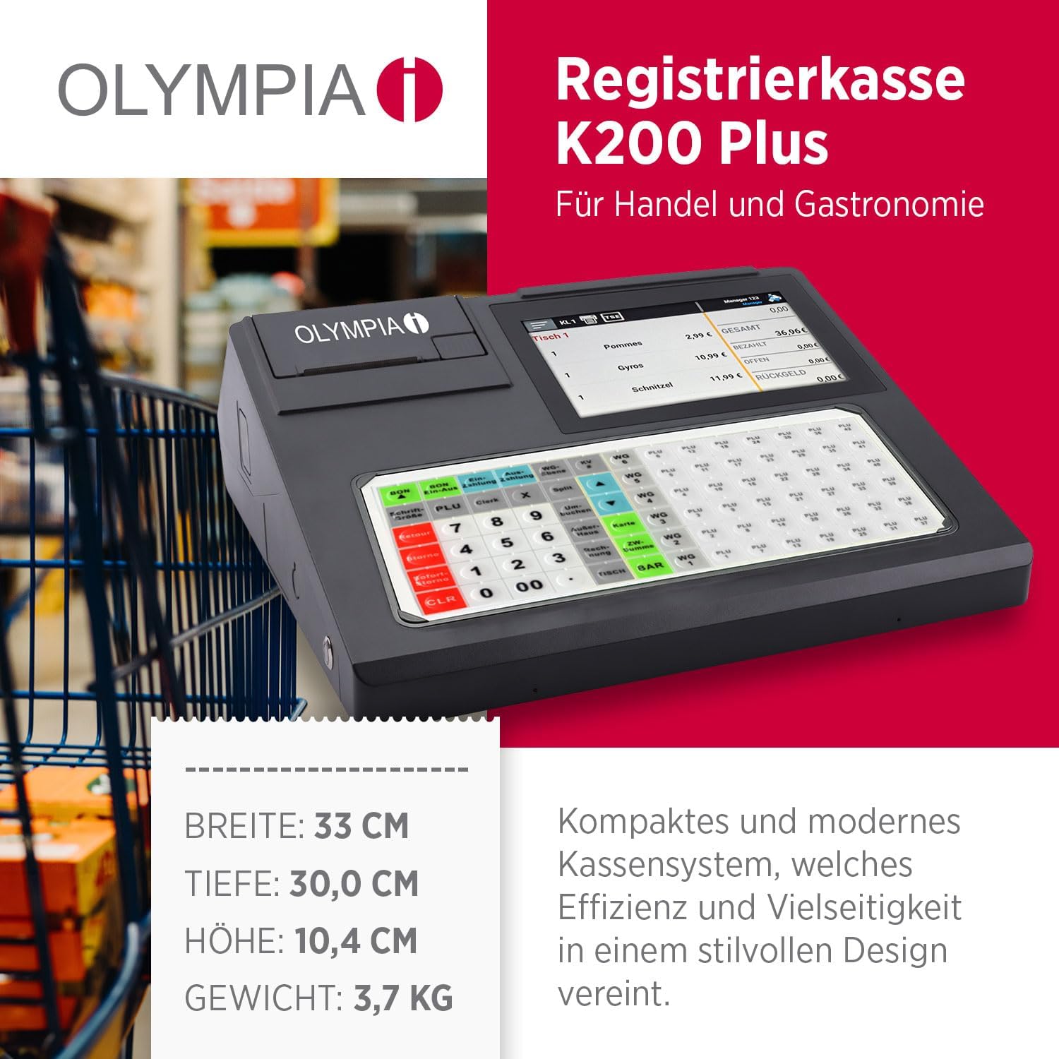 Discover a revolution in case management with Olympia K200 Plus. This modern box system combines efficiency, versatility, and sleek design into one compact device to meet your commercial and catering needs. Note: The TSE license is not included in the delivery. EFFICIENT USE: Featuring an 84-key flat keyboard for fast typing and a 7-inch touchscreen for intuitive navigation. Reliable Printing: The integrated 80mm thermal printer with knife ensures proper and high-quality fluid printing operations (automatic cutting). FLEXIBLE CONNECTION OPTIONS: With 1 LAN port, 4 USB-A ports, 1 serial port and 1 box port, we offer a variety of interfaces to meet your needs. Individual Safety: The optional Dallas lock available makes using the box as convenient as possible, especially for multiple operators. COMPLETE FUNCTIONALITY: With support for 100 product groups and 10,000 PLU, as well as space for 50 operators and 100 tables in the catering. Quality Product: The K200 Plus is a product of the famous Olympia brand, synonymous with reliability and innovation. MODERN DESIGN: A graphic bonus logo adds a personal touch to your transactions. EXTENSION OPTIONS: Integrate optional accessories such as scanners, kitchen printers, external client display and EC terminal (as of 2024) as per your needs. Cloud Connection: Included are the first 6 months and then optional (with additional monthly charges) for data backup and full reports. Immerse yourself in the future of the box with the Olympia K200 Plus, an advanced, reliable and versatile box system that fits your needs perfectly. Technical details in the blink of an eye: 84 keys flat keyboard. 80 mm thermal printer with sheet (automatic cut) for rolls up to 63 mm in diameter. 7" (1024 x 600) Touch Screen Dimensions (WxDxH): 335 x 300 x 105 mm. Weight: 2.8 kg. Customer Display: Single Line LED Drawer: not included. Dallas lock available optional. Processor: RK3566 Quad-core Cortex-A55 1.8GHz 2 GB RAM 16GB Hard Drive Interfaces: 1 x LAN, 4 x USB-A, 1 x Serial, 1 x Box Port Support for 100 product groups and 10,000 PLUs. 50 operators and 100 tables Good graphic logo. Android 11 operating system. Optional accessories available: scanner, kitchen printer, external client display, EC terminal (2024 release) Programming directly to the box without PC program. Cloud connection for data backups and reports for 6 months and then optional (additional monthly charge) Current: DC 12V 5A