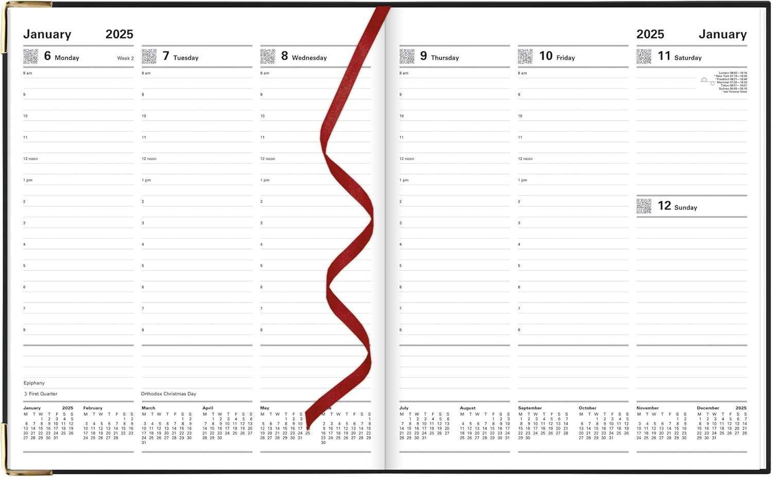 Next-level luxury awaits in the Letts of London® Roma Collection. With genuine Italian leather, the Letts of London® Roma Weekly Planner spans 12 months, January to December 2025, with week-to-view format and vertical/portrait layout. Schedule appointments Monday through Friday in hourly (60-minute) intervals from 8:00 a.m. to 8:00 p.m. with ruled spaces included for Saturday and Sunday. Contains numbered weeks, yearly reference calendar at the bottom of each two-page spread, and ruled space for notes. Sewn-bound construction with hand-crafted, flexible, soft-grained genuine Italian leather, stitched edges and golden motif: gold corners, gilt page edges and gold foil date detail. Classic Diary Style with extra bonus content pages featuring: personal information, calendar, international information, notable dates, religious festivals, useful conversion tables, yearly planners, holiday planner, key events planner, British Isles road map, world maps, city maps, national rail map, cash account, city information, clothing sizes, gift and zodiac information, North America toll-free numbers, weekly sunrise and sunset times (not all contents are included in all sizes). Ribbon bookmark / page marker helps keep place among the pages throughout the year. 70 gsm white paper comes from sustainable sources. Black cover, size: Quarto, 10.25" x 8.25". English. Made in Great Britain. Comes with gift box. Embrace the future of planning with Plan & Link™. Plan, scan, click and go using the free Letts of London® Reminder app, powered by InkLink™ technology. Download from the App Store and Google Play. For more than 200 years, Letts of London® combines both aesthetics and functionality with each product, handmade from high-quality materials with exceptional attention to detail. Time-honored techniques are still used to produce all diaries, as well as provide an unrivaled level of craftsmanship. Traditional book-binding methods passed down through generations are maintained today as they ensure the best quality results. Designed, manufactured and hand-finished in Great Britain. Letts of London® Since 1812. (C33YIBK)