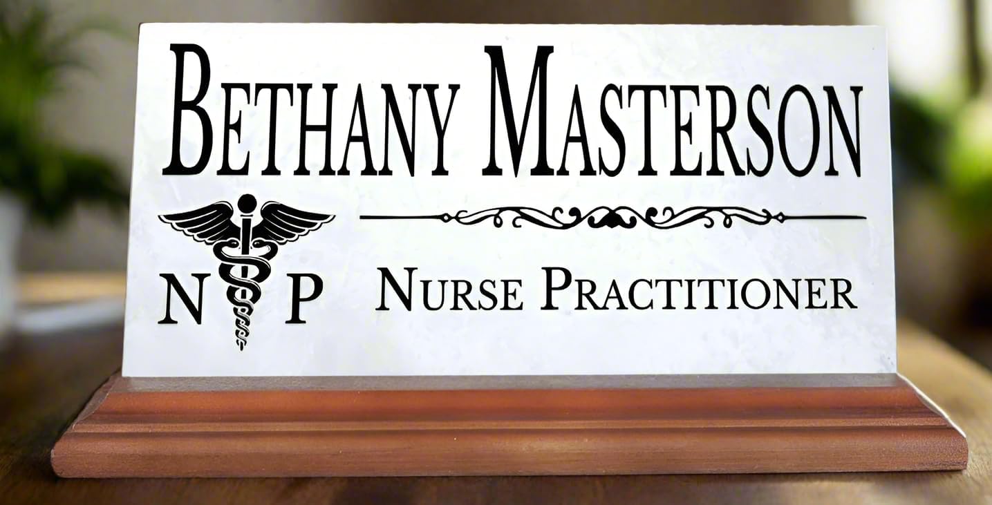 🩺 Nurse Practitioner Desk Name Plate – Personalized Solid Marble Office Name Sign with Custom Title – Professional Gift for NP or Graduation – 4” x 8” with Hardwood Base Recognize the care, expertise, and professionalism of your favorite nurse practitioner with this personalized desk name plate, custom-crafted from solid marble and finished with a handcrafted hardwood base. Perfect for new certifications, clinic upgrades, graduation, or appreciation, this unique NP desk sign is personalized with your nurse practitioner’s name and credentials, and printed directly into the stone for a lasting, polished finish. Each nameplate is printed using our signature Frescoprint process, which embeds the design into the marble for a textured, elegant appearance. The result is a professional-grade display that looks just as at home on a medical office desk as it does on a bookshelf or mantel. 📏 Plaque Size: 4" H x 8" W (excluding base) 🪨 Material: Solid Imported Marble 🪵 Base: Handcrafted Hardwood, Made in Virginia 🇺🇸 Proudly Personalized in the USA 🎁 Ideal for: Professional gifting, graduation, new office setup, retirement, or NP week