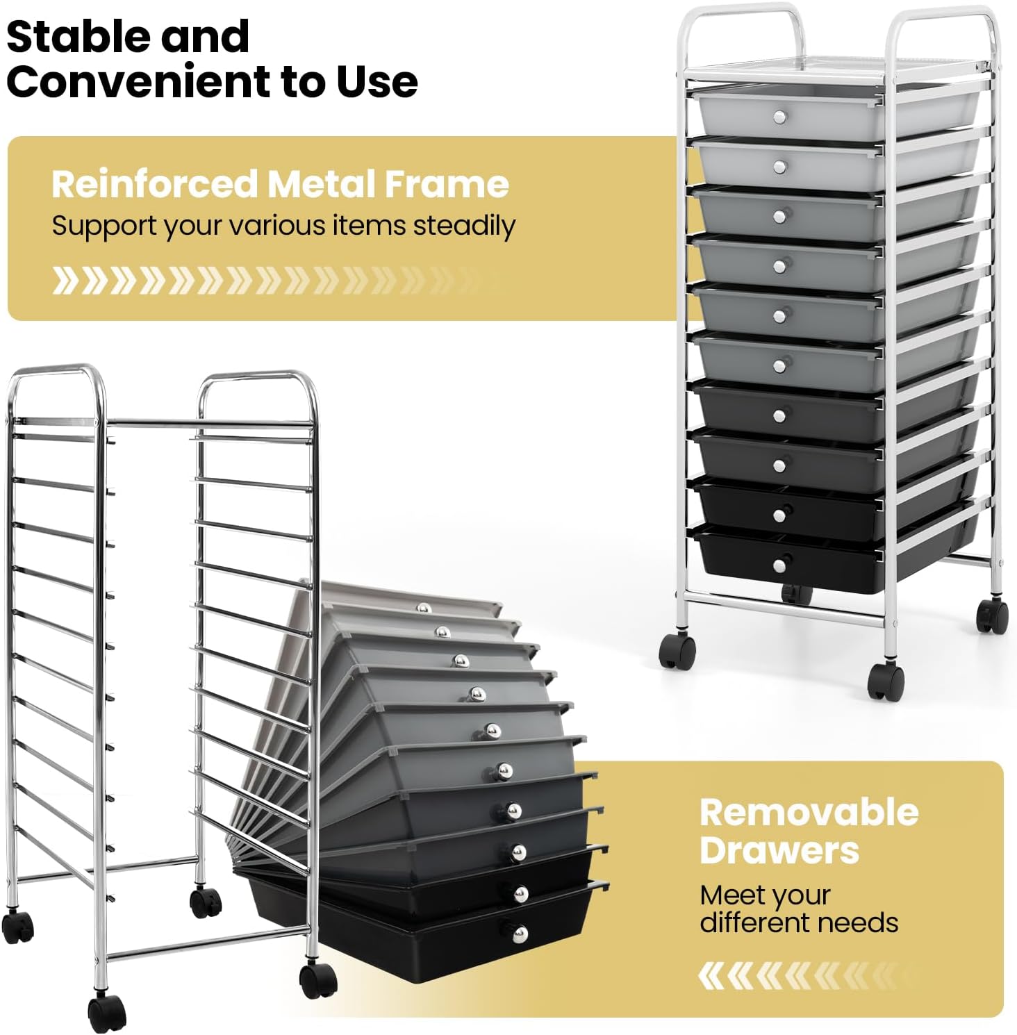 DescriptionThis individual 10-drawer trolley features 10 plastic drawers with silver drawer handles and a sturdy caster with a sturdy, smooth metal frame.The drawers are made of solid, colored, transparent materials that make everything easy to see, while removable casters facilitate movement.You can keep our 10 drawer rolling trolley in the kitchen for recipes, gadgets, and napkins. Keep this organizer tools in your office for documents, mail, and other supplies.This portable storage cart can also be placed in a garage or workshop to store tools, screws and other hardware. It is also ideal for classrooms where art and crafts are stored in a simple place.You can even use it in retail Settings to sort inventory items or paperwork.FeaturesEnvironmental, wear-resisting, and anti aging PP material ensures safe use10 drawer storage cart providing plenty of space for keeping your home office supplies tidy and close, organizing makeup and cosmetics, and storing arts and crafts suppliesTop handles make it easy to push and pull, 2 side handles make it convenient for you to move the cartSturdy chrome plated steel frame for long lasting performanceThe drawers slide unattached through metal channelsCastors with brakes ensure mobility and stabilitySmooth and flat tabletop is a good design for storing home or office stuff, ideal For Storing Small Tools In Office, Home, School, GarageSpecificationsColor: As pictures showMaterial: Steel + PPNet Weight: 9.5 lbsDrawer Size:15’’ x 11.5’’ x 2.5’’(L x W x H)Overall Size: 15'' x 13'' x 34'' (L x W x H)Package Includes:1 x 10 Drawers Rolling Cart1 x User's Manual