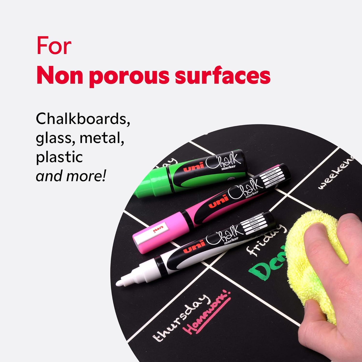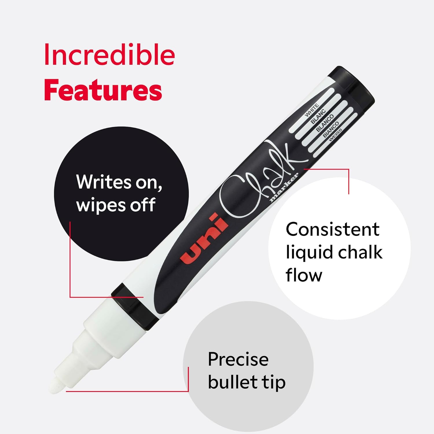 Uni-Ball Liquid Chalk Markers 12 Pack Water Resistant The uni-ball Chalk Marker writes on and wipes off making it the perfect tool for writing on non-porous surfaces such as chalkboards and glass. Perfect for pub, and restaurant signs, its broad bullet tip makes this pen a great all-rounder, good for hand lettering and bold, robust drawings. Not suitable for porous surfaces.