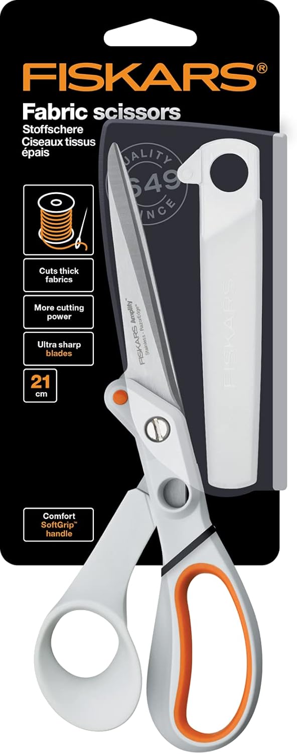 Razor Edge all-purpose scissors (scissor length: 21 cm) for cutting particularly thick materials such as fabrics, Leather, upholstery fabrics or PVC, Suitable for right-handed people- Pleasant grip and firm hold thanks to ergonomically shaped handles with thumb and finger loops made of plastic and Softgrip grip surface- Precise cutting of thick materials without pressing the blades apart: Automatic adjustment of the correct blade angle, very sharp blades thanks to 45 degree grinding, Long lasting cutting performance due to optimum steel hardness- High durability, Easy, hygienic cleaning, Dishwasher safe, Protective cap for safe storage, Finnish design- Contents: 1x Fiskars Amplify Razor Edge all-purpose scissors, Dimensions: scissor length: 21 cm, Weight: 100 g, Material: stainless steel/plastic, Colour: white/orange, 1005223