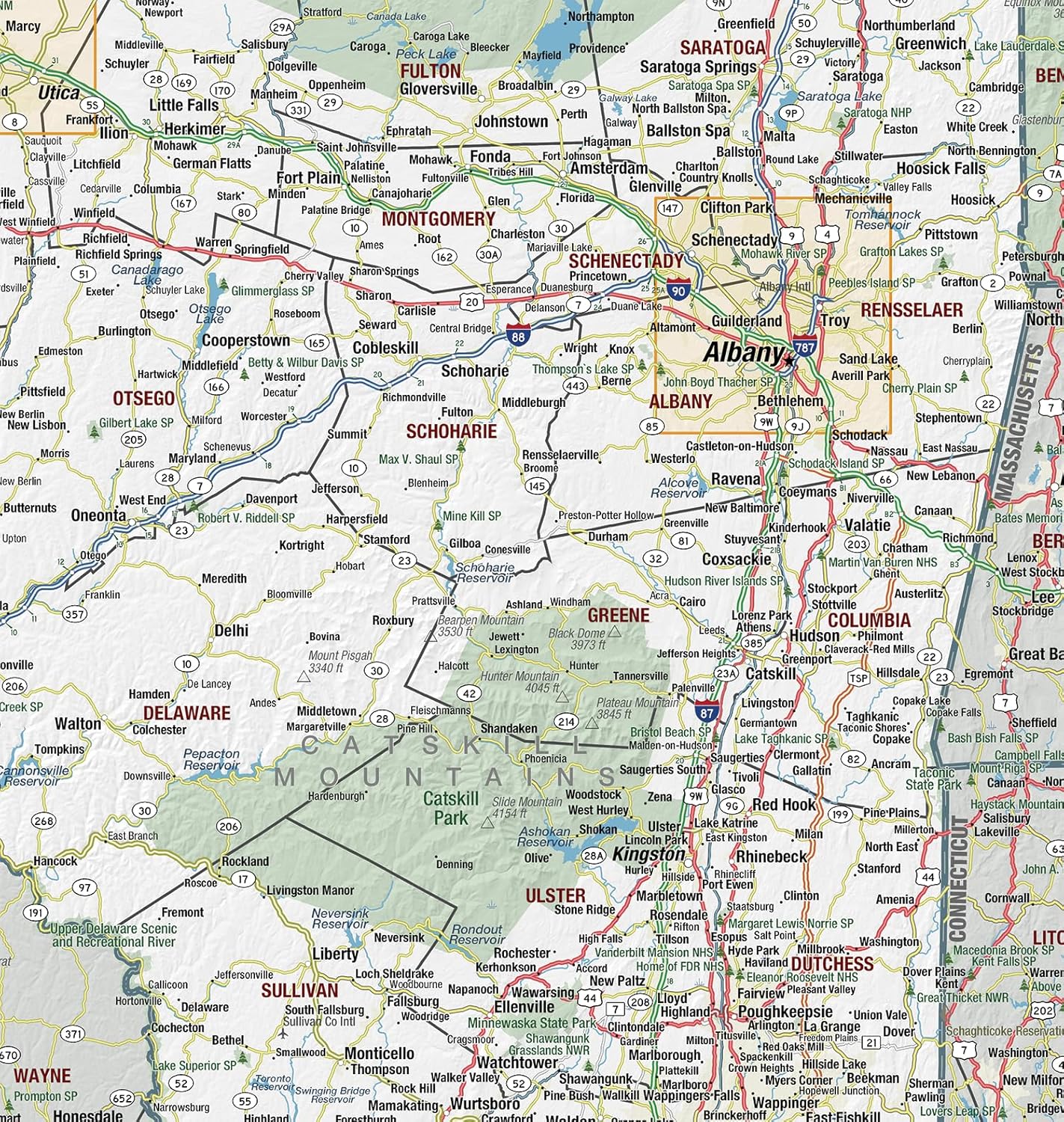 Discover the diverse geography of New York State with our highly detailed state map. Our New York State map includes all cities, towns, counties, highways,major landmarks, and more. With a warm and subtle color palette and clear labels, it is easy to find what you are looking for. Our map of New York State is a perfect resource for teachers, students, travelers, and map enthusiasts. Explore the many facets of New York’s culture and history with the inclusion of important Indigenous land and landmarks.