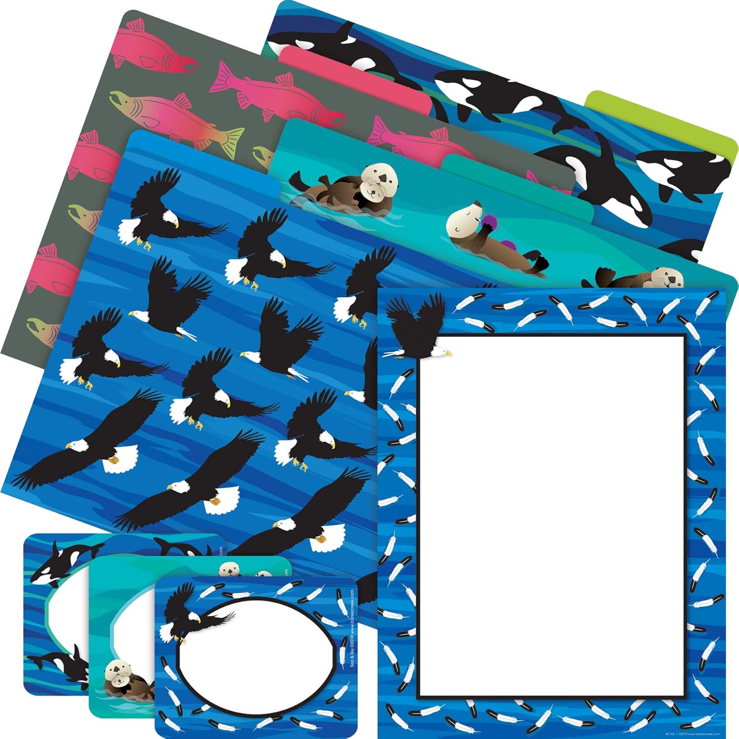 Barker Creek's Sea & Sky Whales Get Organized Kit will help you stay on task in style! Included in this popular set are 12 letter-sized fashion file folders, 45 self-adhesive labels/name badges, and 50 sheets of coordinating computer paper. The file folders are printed on sturdy 14 point cardstock, feature 1/3 cut tabs, and are reversible. The self-adhesive labels measure 3.5" x 2.75" and there are 45 per package -- 15 each of 3 designs. The coordinating paper is compatible with most laser and inkjet printers and measures 8.5" x 11". Say goodbye to boring old office supplies and hello to fun and fashion! Coordinating products available: Search Barker Creek Sea & Sky.