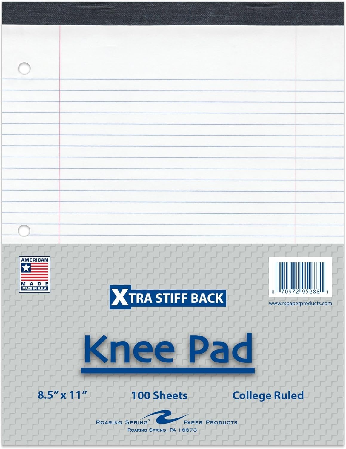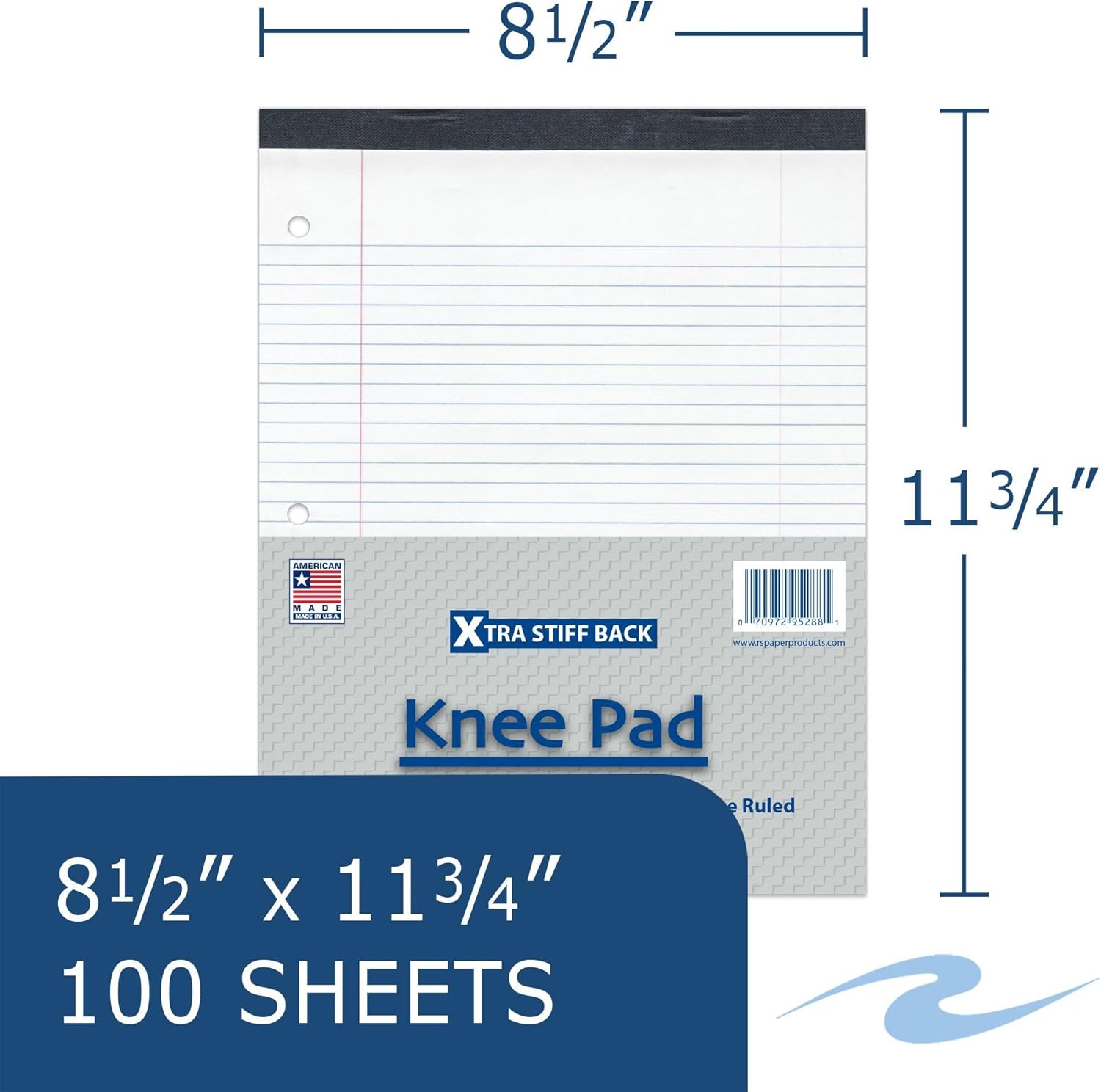 White paper stiff-back pad. Smooth, white, 15# writing paper has college ruled blue lines and a red margin line. Sheets are micro-perforated for EZ removal. Extra heavy 80 pt chipboard backs allow for lap usage, or use as a clipboard. Stapled and taped construction. Full sheet size is 8.5" x 11.75"", and tear-out size is 8.5" x 11". 3-hole punched to fit in standard 3-ring binders, and individually polywrapped. 100 sheets per pad. 18 units per case. Sold by the Case