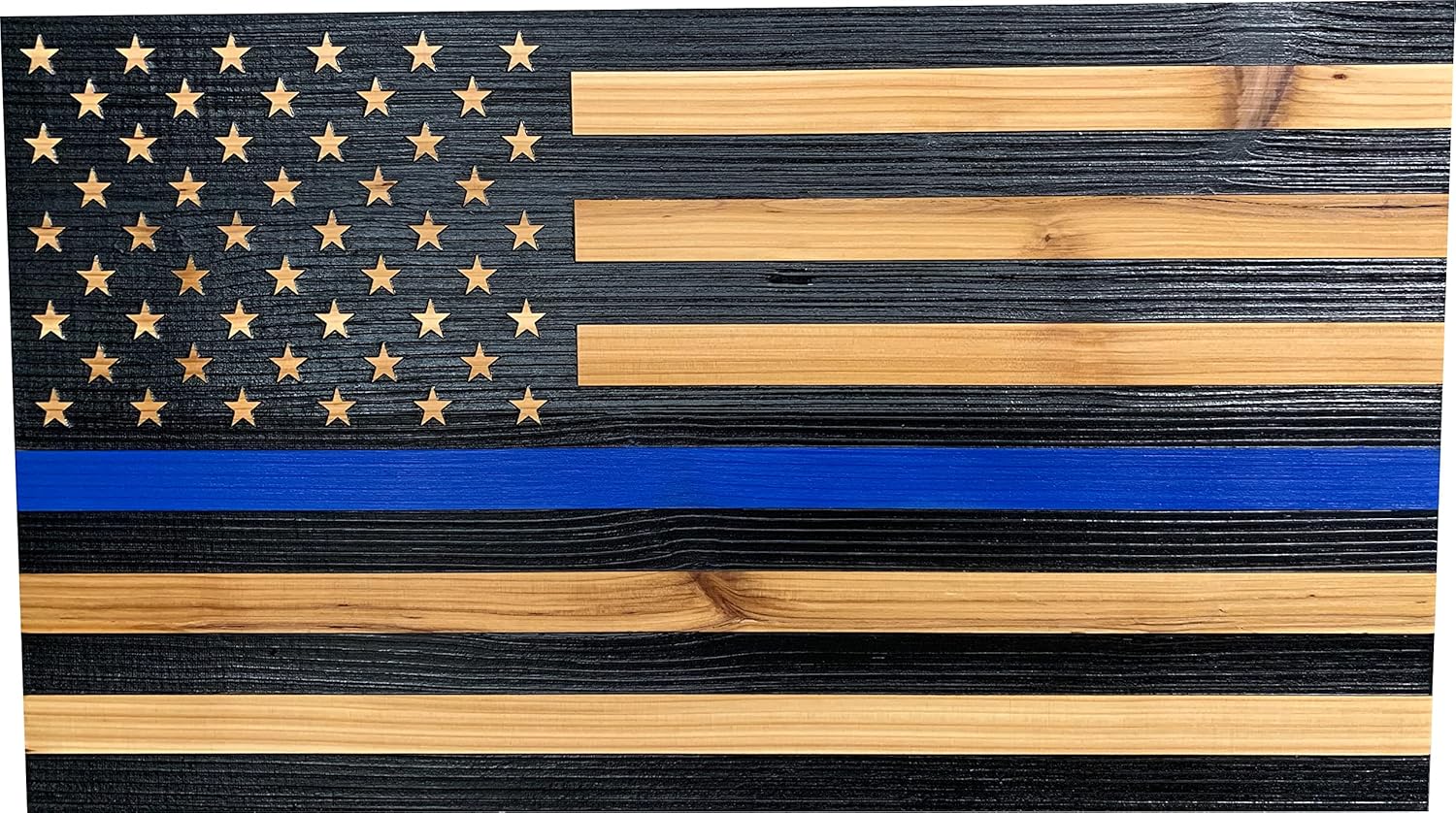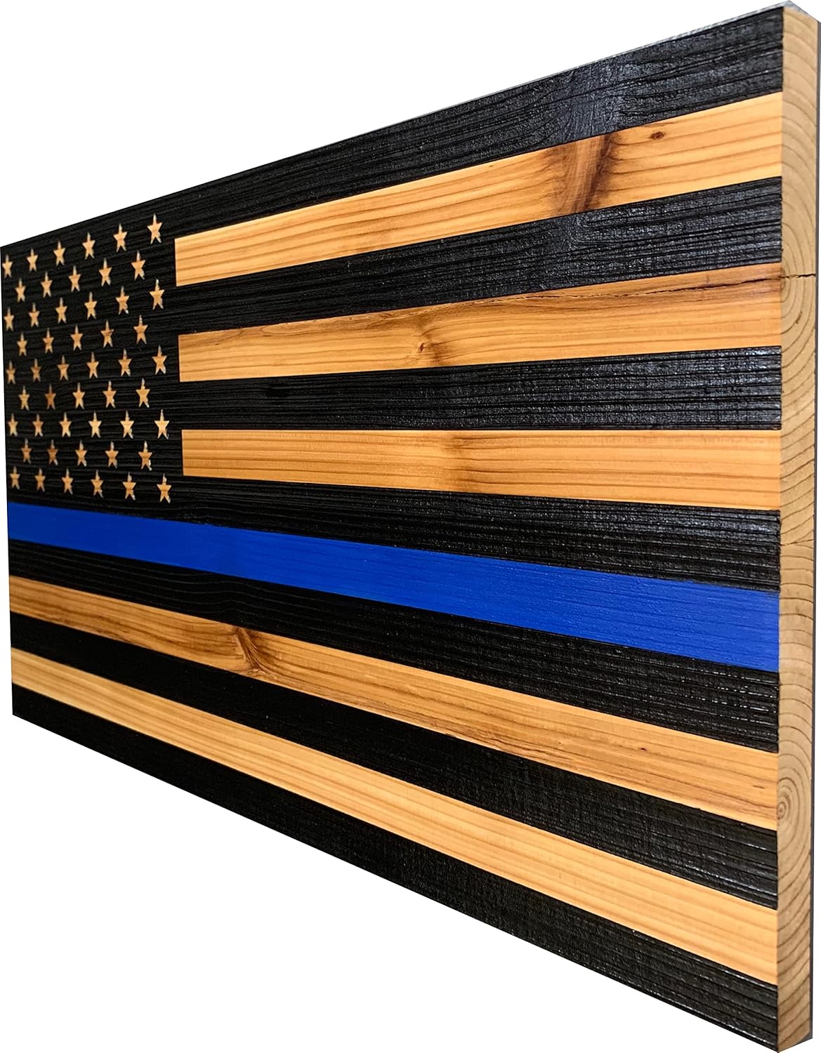 Bellewood Designs solid wood American Flag wall decoration is made in the U.S.A. from American sourced materials. This flag is made from solid cedar, engraved, hand painted, finished with high gloss and has hanging hardware pre-installed so it's ready as soon as you get it.We have four styles of our wood American Flag decoration available: - Red, Wood and Blue - Natural Wood - Blue Line Police Flag - Red Line Firefighter FlagOur American Flags are customizable with your own text using the available option. This makes it a great personalized American Flag gift for a new family, housewarming, firefighter, police officer, a new U.S. citizen and also for great all occassions.