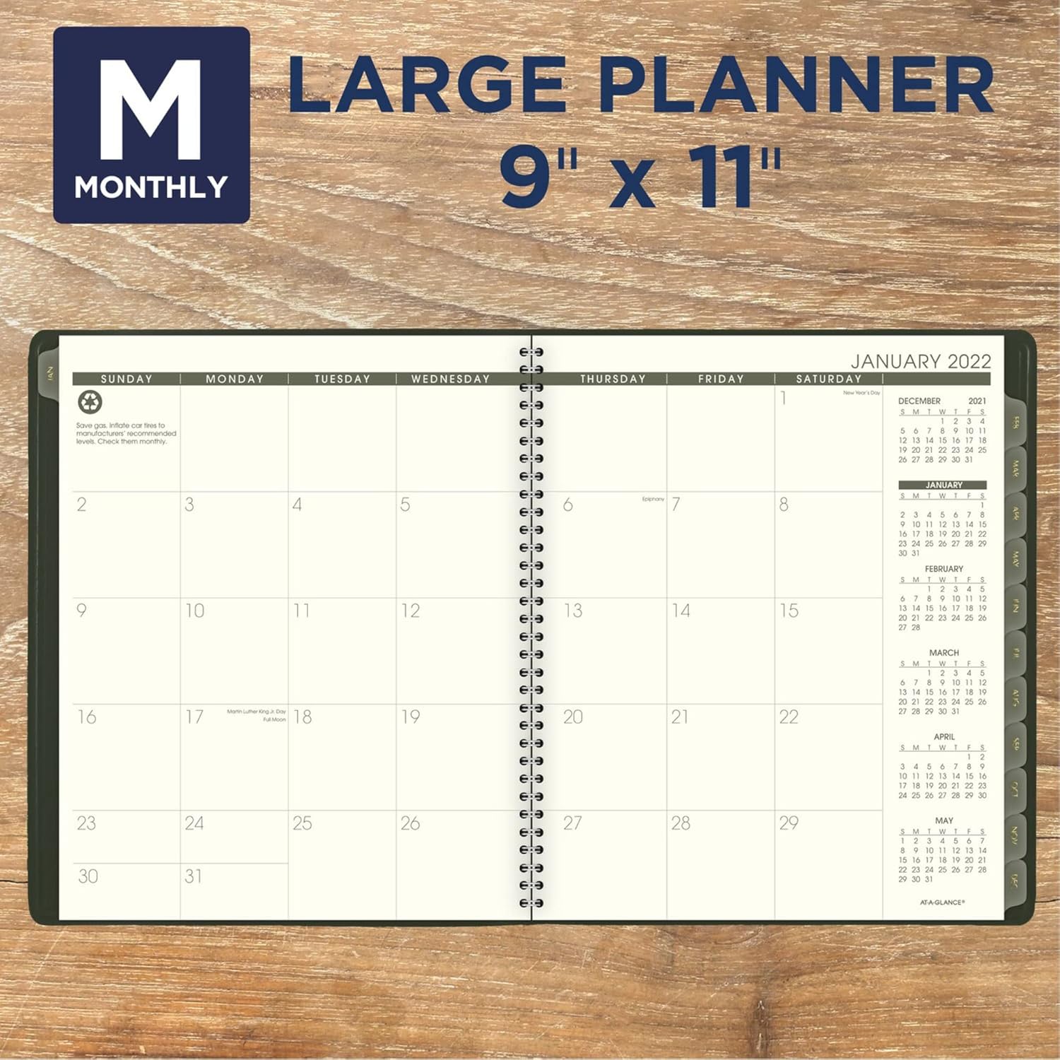Keep track of important deadlines, special events and more while making an environmentally conscious choice. The AT-A-GLANCE Recycled Monthly Planner covers 13 months from January 2022 - January 2023. This planner is made from post-consumer waste recycled materials, with 100% recycled paper and a 50% recycled cover. Great for long-term plans, each month covers two pages. Features unruled daily blocks for open scheduling, reference calendars and green living tips. Pages measure 9" x 11". Take charge of your schedule with classic style. Planner has a green cover and wirebound design to help keep pages secure for prolonged use. Extra pages include contacts, 3 year calendar reference and notes. ACCO Brands will replace any AT-A-GLANCE planner that is returned within one year from the date of purchase. Contact ACCO Brands Consumer Affairs at www.ataglance.com for instructions.