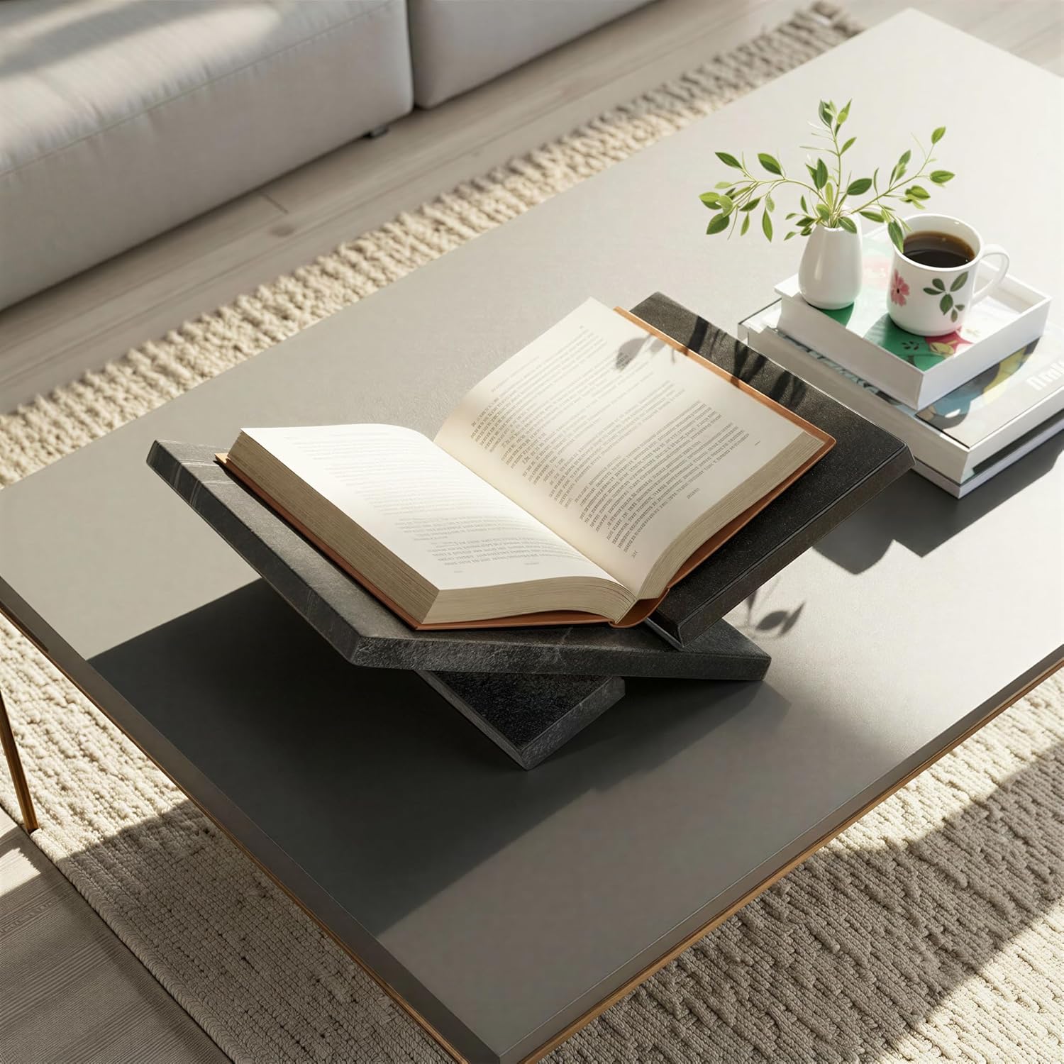 This marble book holder is a practical and beautiful addition to the home, made of natural marble with a Ebony color that adds brightness and sophistication. Its rectangular and flat shape is perfect for holding books, magazines, cookbooks, or tablets. It can be used in various spaces, such as living rooms, bedrooms, kitchens, or offices, and can match different decor styles like Scandinavian, boho, global, modern, or French country. The holder also creates a classy and cozy atmosphere in the space. It's a great way to enjoy the beauty and functionality of marble in the home or a thoughtful gift for those who appreciate natural and refined products.