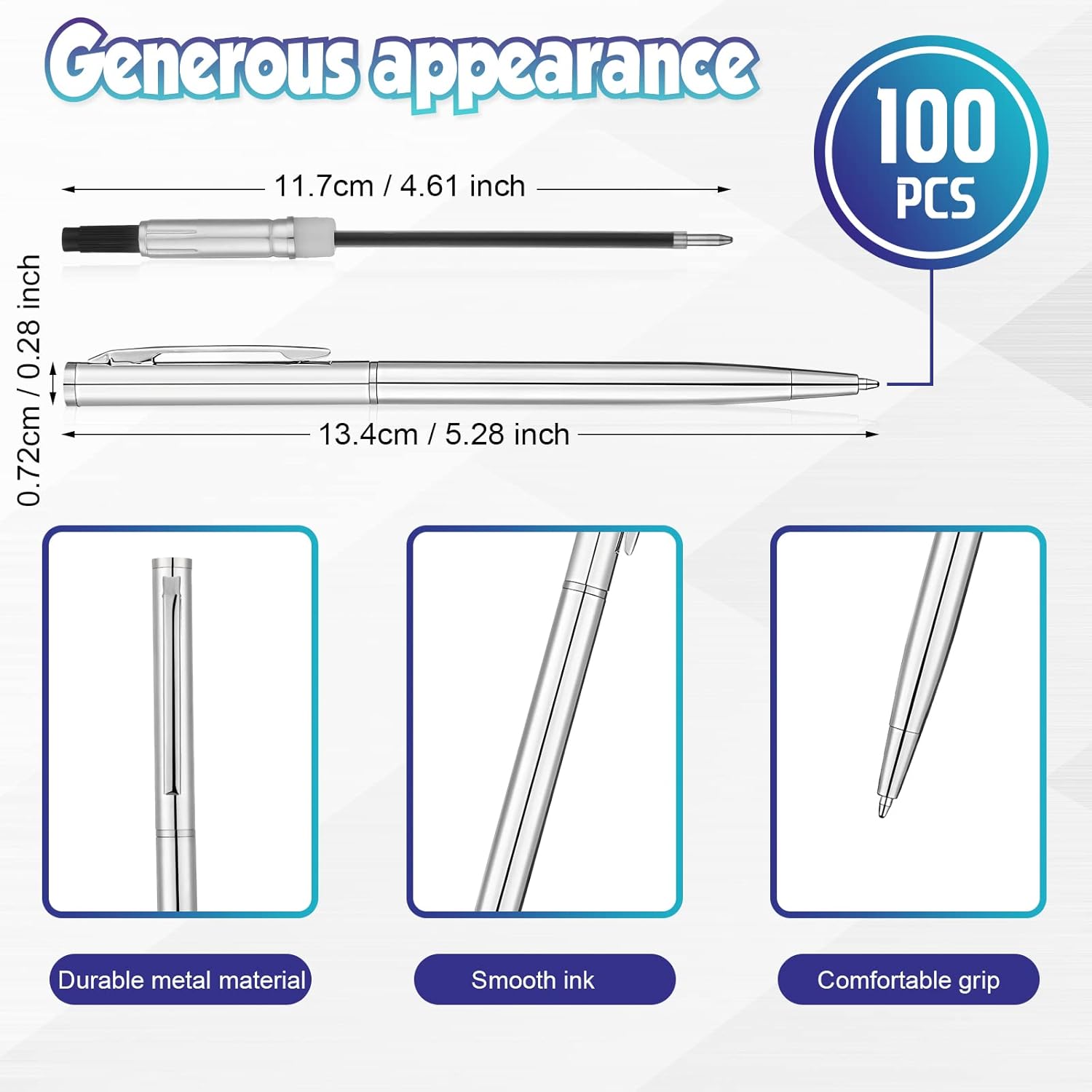 Features: Retractable ballpoint pens medium point have evenly flowing ink and the nib can slide on the paper, writing smoothly and making you feel comfortable to get a good writing effect, suitable for a long time use. Our black ink ballpoint pen 1mm can serve as an ideal present which you can send to your family, friends, coworkers and more, and they will be happy and delighted to receive it. Specifications: Material: metal Color: silver Size: about 5.5 inch Package includes: 100 x Metal ballpoint pen Notes: Manual measurement, please allow slight errors on size. The color may exist a slight difference due to different screen displays.