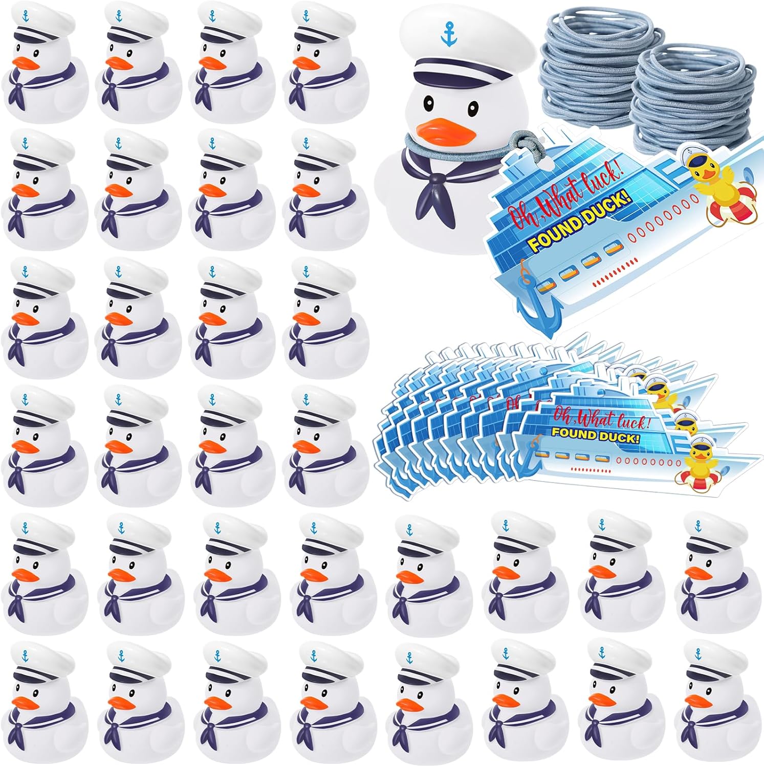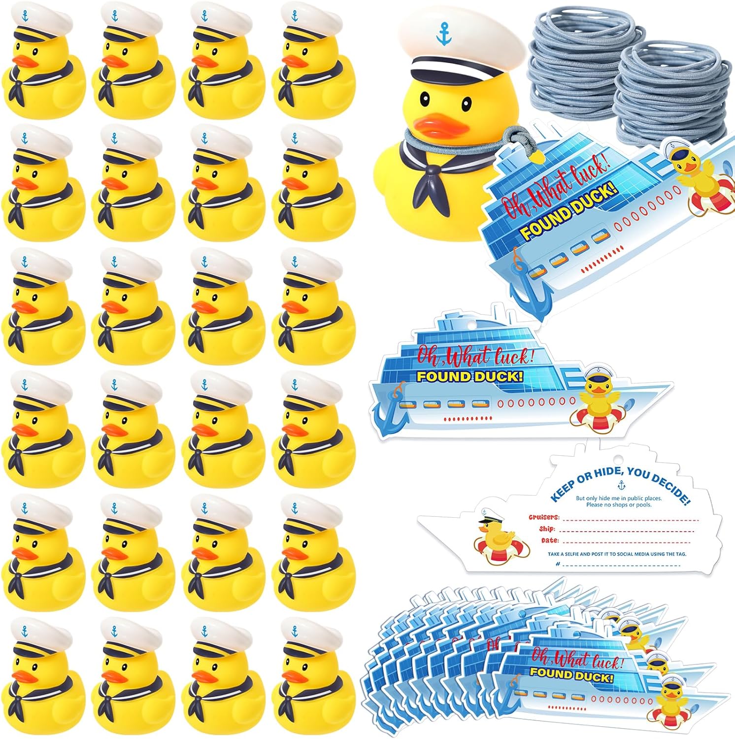 Features: Memorable props: These duck tags for cruise ducking and mini ducks also serve as memorable props for fun photos. The ducks with glowing in the dark design can help you etch down fabulous memories of your cruise adventures or parties. Cute decorative elements: These rubber ducks with tags also make for delightful decorations. Place them in your living room, office, car, or other spaces for a dash of cheer and charm. Specifications: Material: rubber, paper Color: blue, pink, white, yellow, green Size: Cruise duck: 2 x 1.9 x 2.4 inches/ 5 x 4.8 x 6 cm Cruise luggage tag: 3.96 x 1.84 inches/ 10.06 x 4.68 cm Rubber band: 1.6 inches/ 4 cm in diameter Package includes: 40 x Mini cruising rubber ducks 40 x Cruise tag cards 40 x Elastic rubber bands Notes: Manual measurement, please allow slight errors on size. The color may exist a slight difference due to different screen displays. Words on our product are not as trademarks, our trademark is Lenwen, kindly noted.
